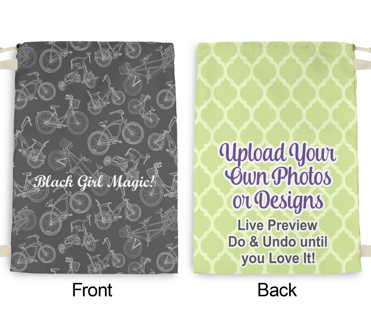 Carry your laundry in style with these customized laundry bags. Available in two sizes, featuring a natural colored woven strap and a cinch cord, these bags hold a lot of clothes or anything else you want to fit in them.