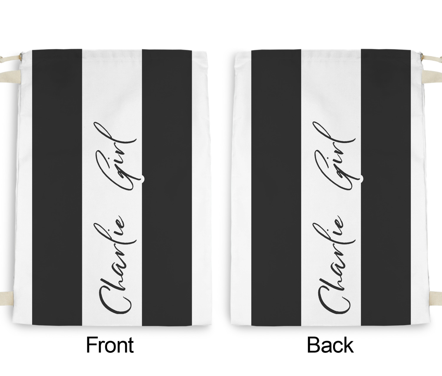 Carry your laundry in style with these customized laundry bags. Available in two sizes, featuring a natural colored woven strap and a cinch cord, these bags hold a lot of clothes or anything else you want to fit in them.