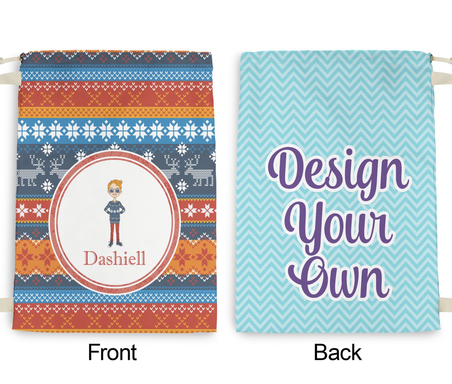 Carry your laundry in style with these customized laundry bags. Available in two sizes, featuring a natural colored woven strap and a cinch cord, these bags hold a lot of clothes or anything else you want to fit in them.