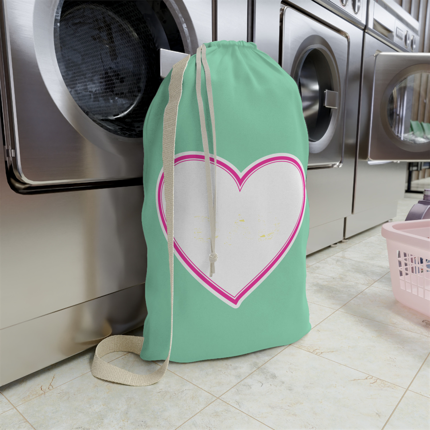 Carry your laundry in style with these customized laundry bags. Available in two sizes, featuring a natural colored woven strap and a cinch cord, these bags hold a lot of clothes or anything else you want to fit in them.