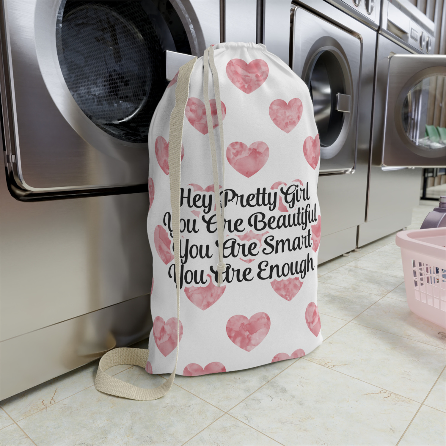 Carry your laundry in style with these customized laundry bags. Available in two sizes, featuring a natural colored woven strap and a cinch cord, these bags hold a lot of clothes or anything else you want to fit in them.