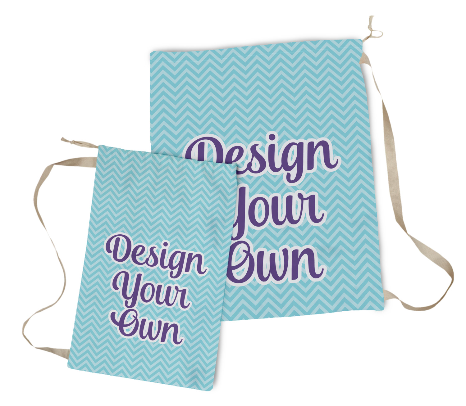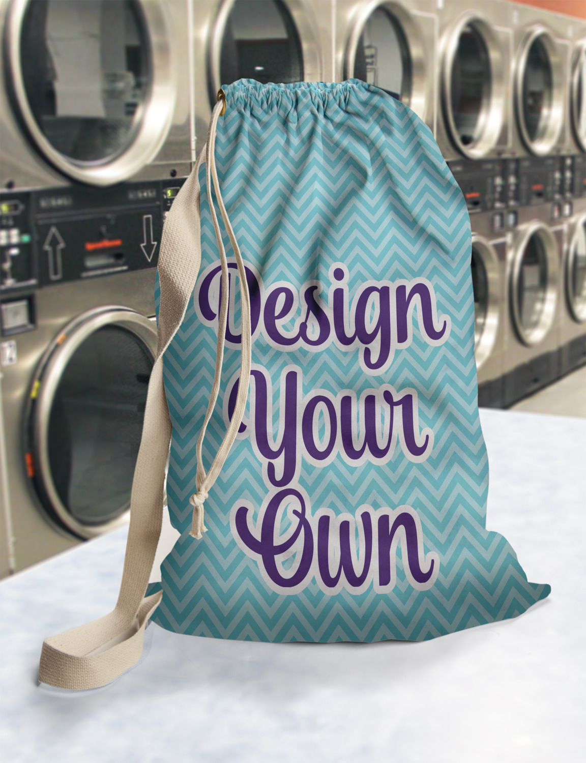 Carry your laundry in style with these customized laundry bags. Available in two sizes, featuring a natural colored woven strap and a cinch cord, these bags hold a lot of clothes or anything else you want to fit in them.