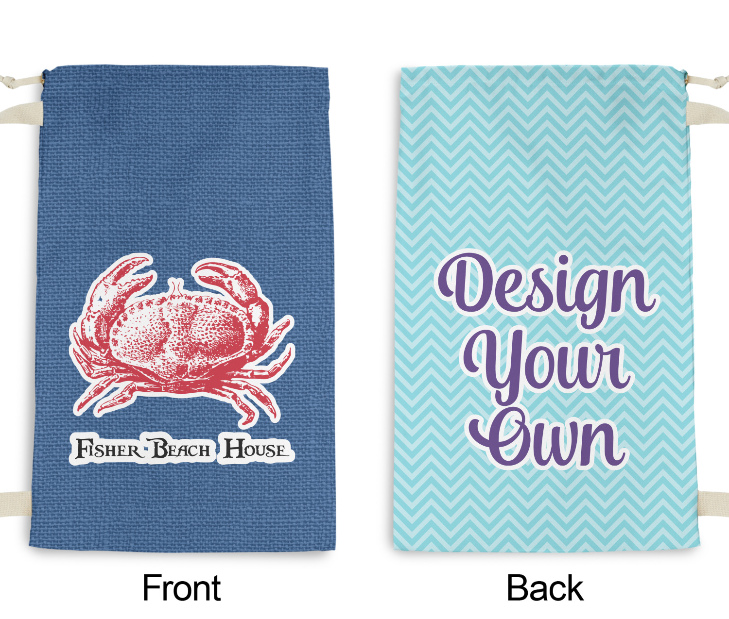 Carry your laundry in style with these customized laundry bags. Available in two sizes, featuring a natural colored woven strap and a cinch cord, these bags hold a lot of clothes or anything else you want to fit in them.