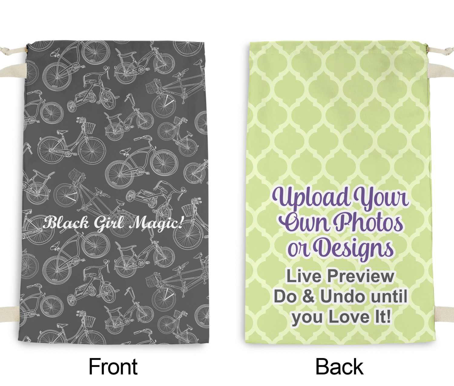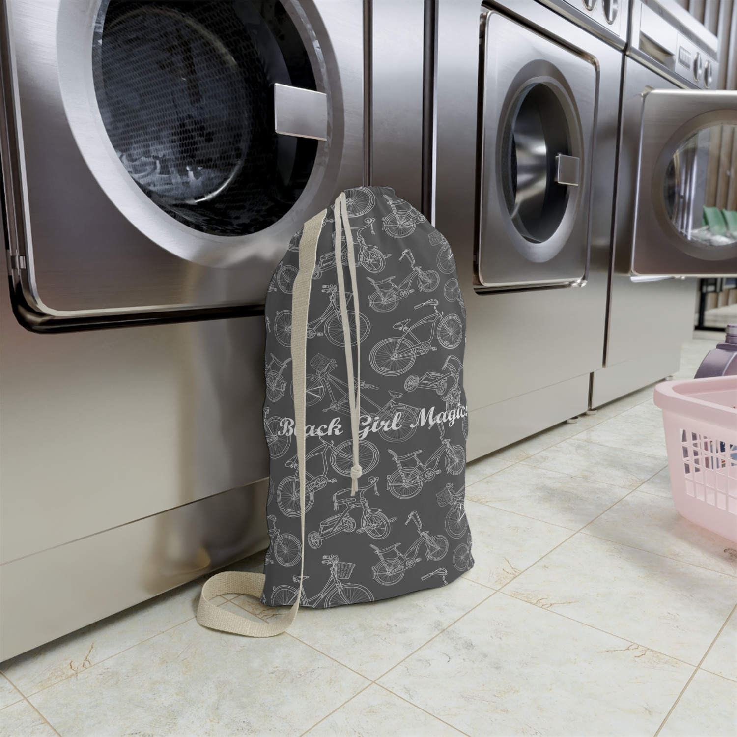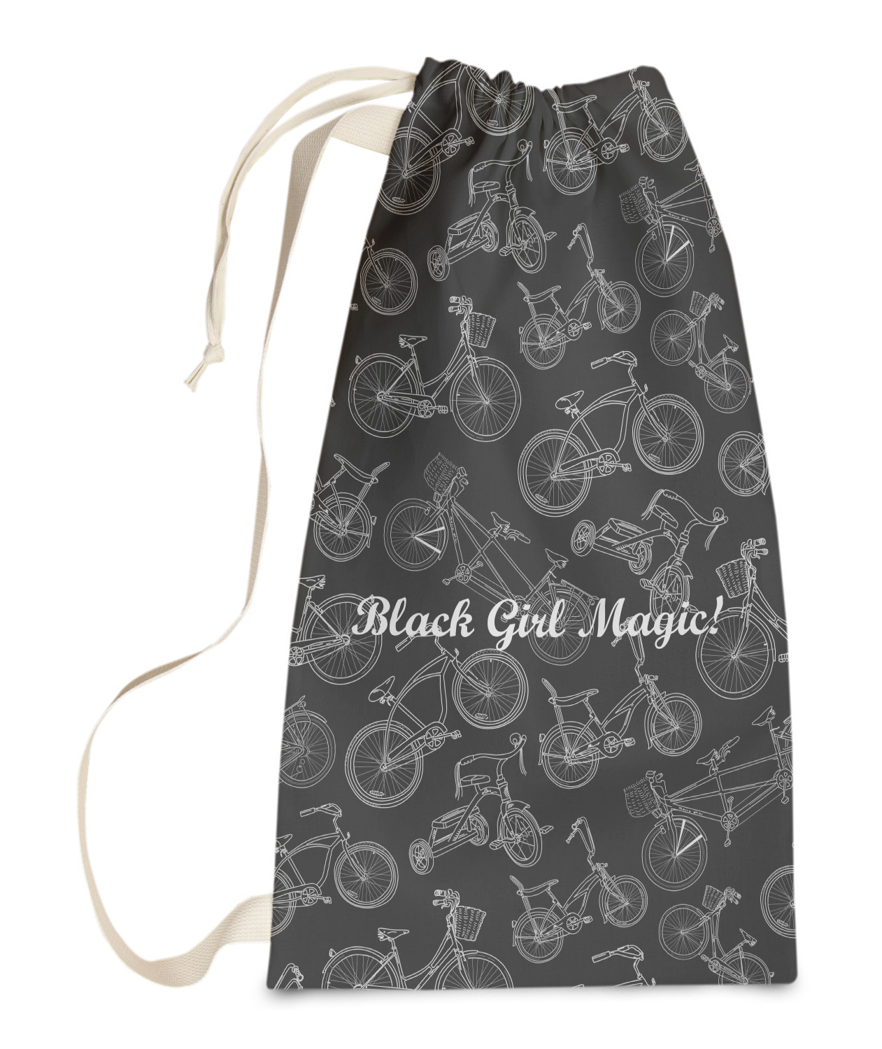 Carry your laundry in style with these customized laundry bags. Available in two sizes, featuring a natural colored woven strap and a cinch cord, these bags hold a lot of clothes or anything else you want to fit in them.