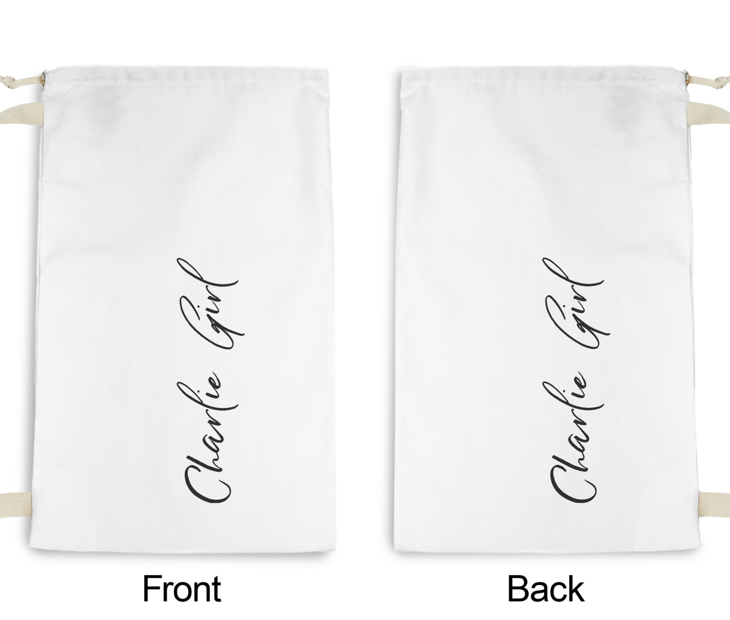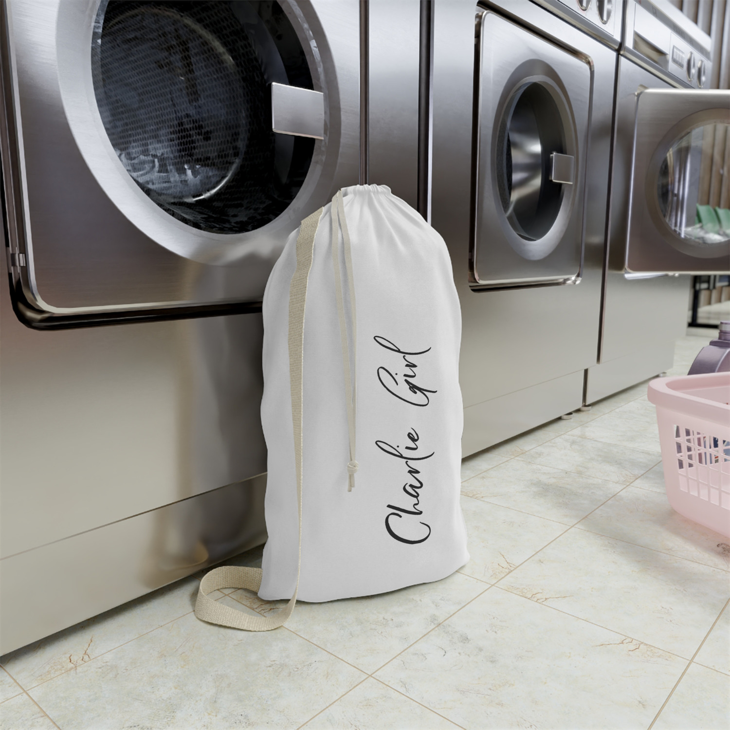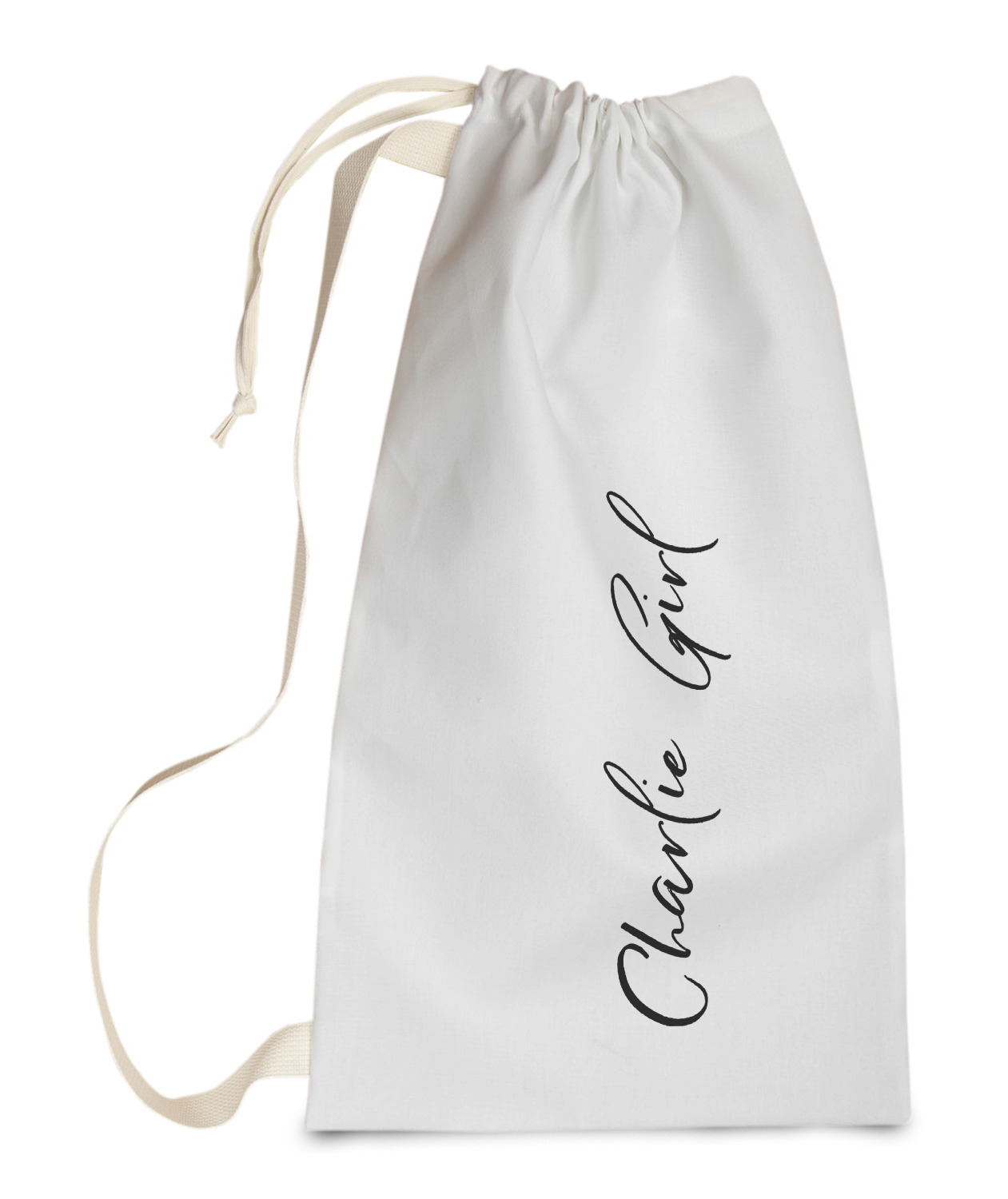 Carry your laundry in style with these customized laundry bags. Available in two sizes, featuring a natural colored woven strap and a cinch cord, these bags hold a lot of clothes or anything else you want to fit in them.
