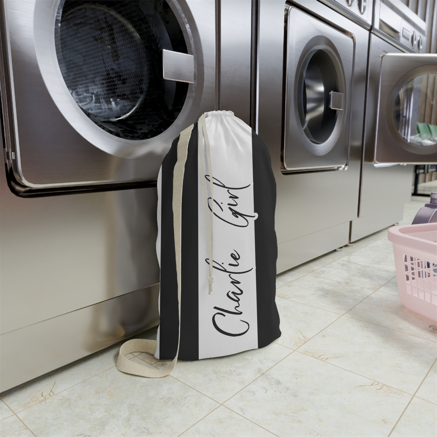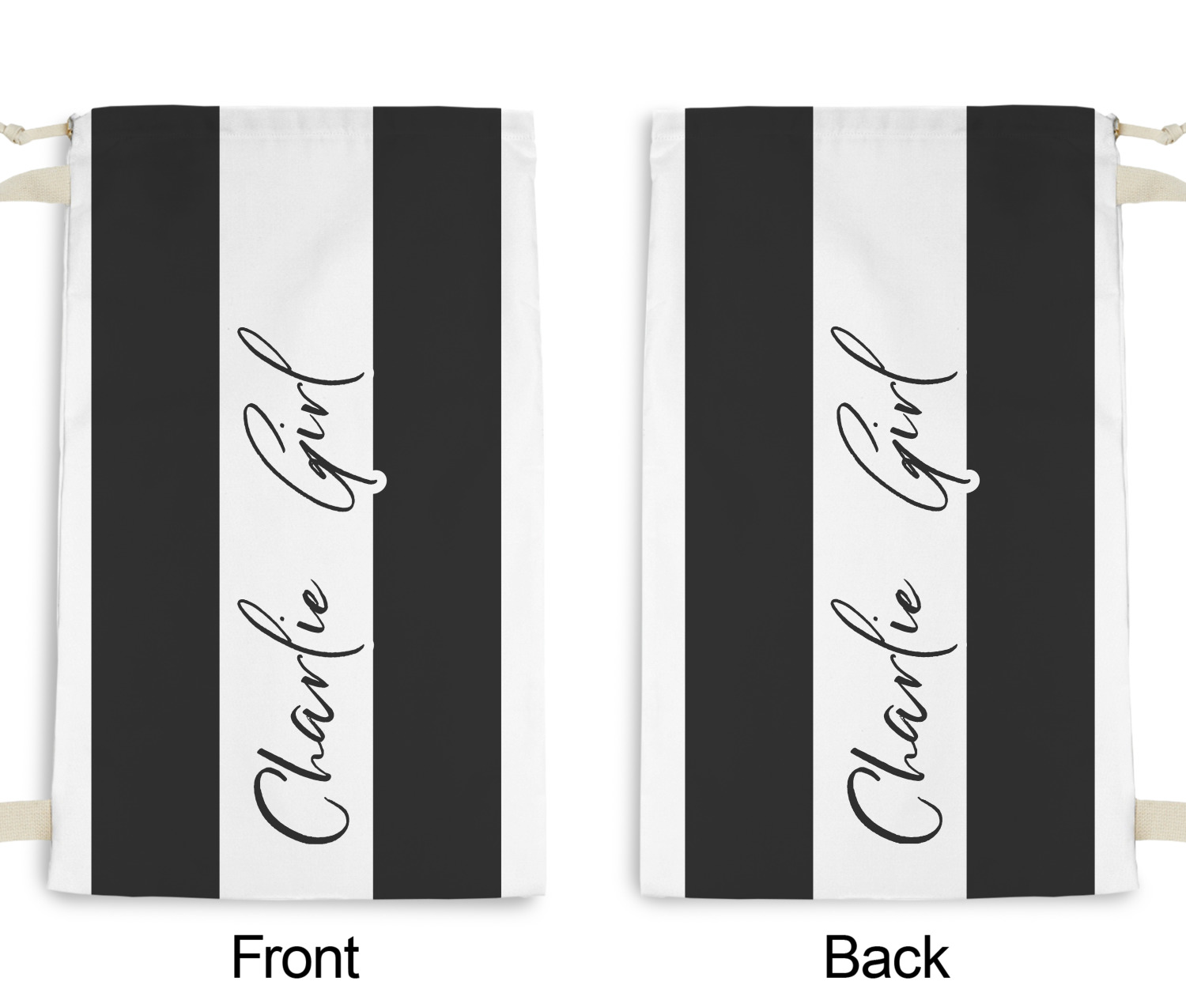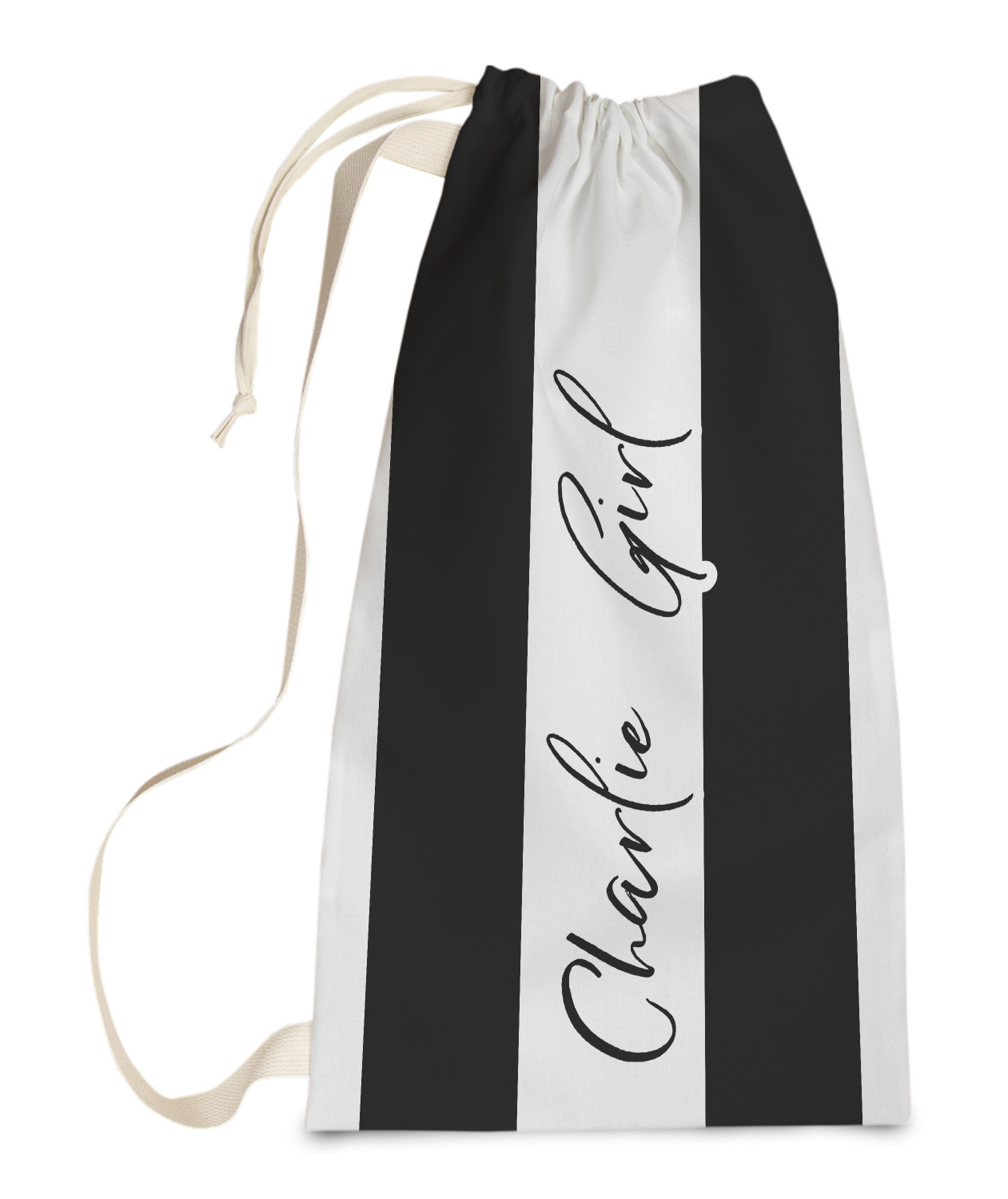 Carry your laundry in style with these customized laundry bags. Available in two sizes, featuring a natural colored woven strap and a cinch cord, these bags hold a lot of clothes or anything else you want to fit in them.