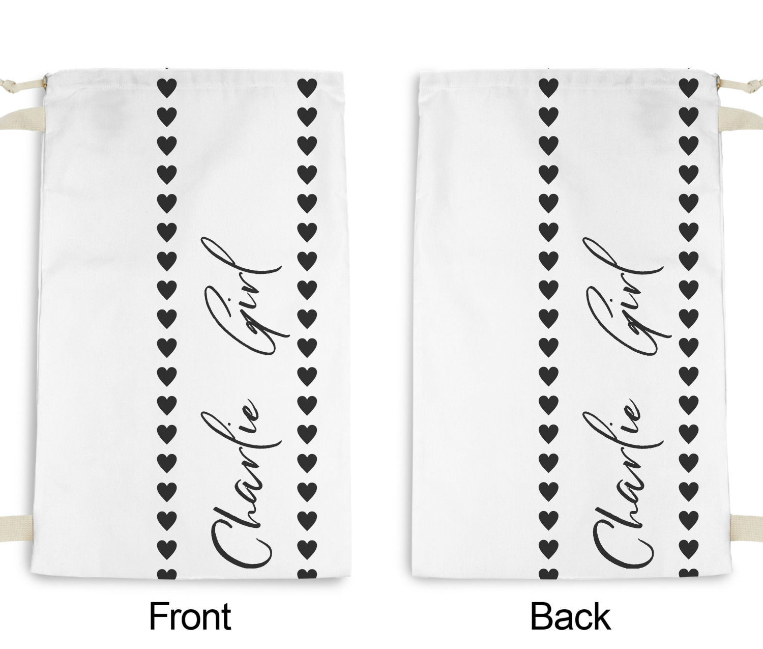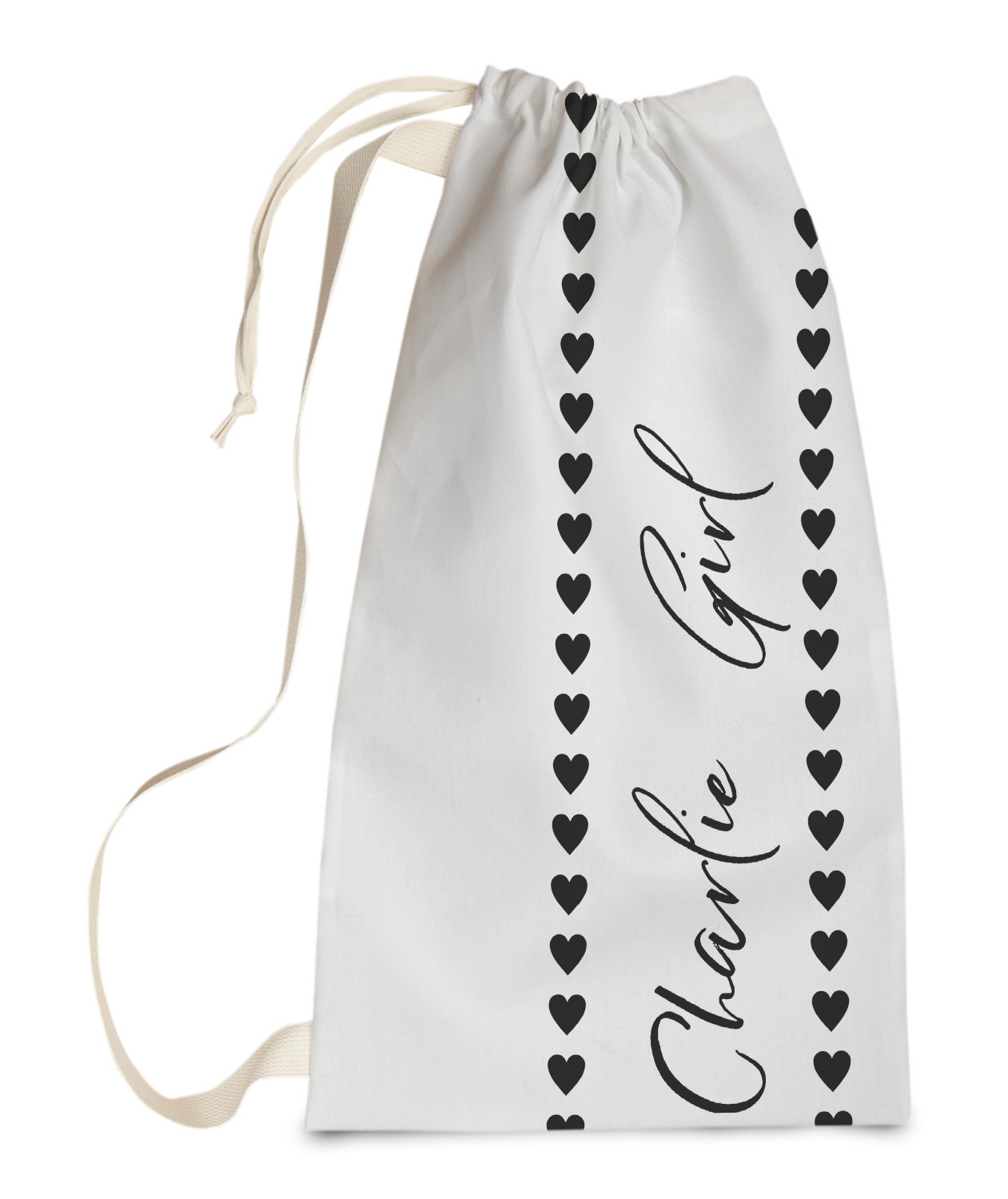 Carry your laundry in style with these customized laundry bags. Available in two sizes, featuring a natural colored woven strap and a cinch cord, these bags hold a lot of clothes or anything else you want to fit in them.