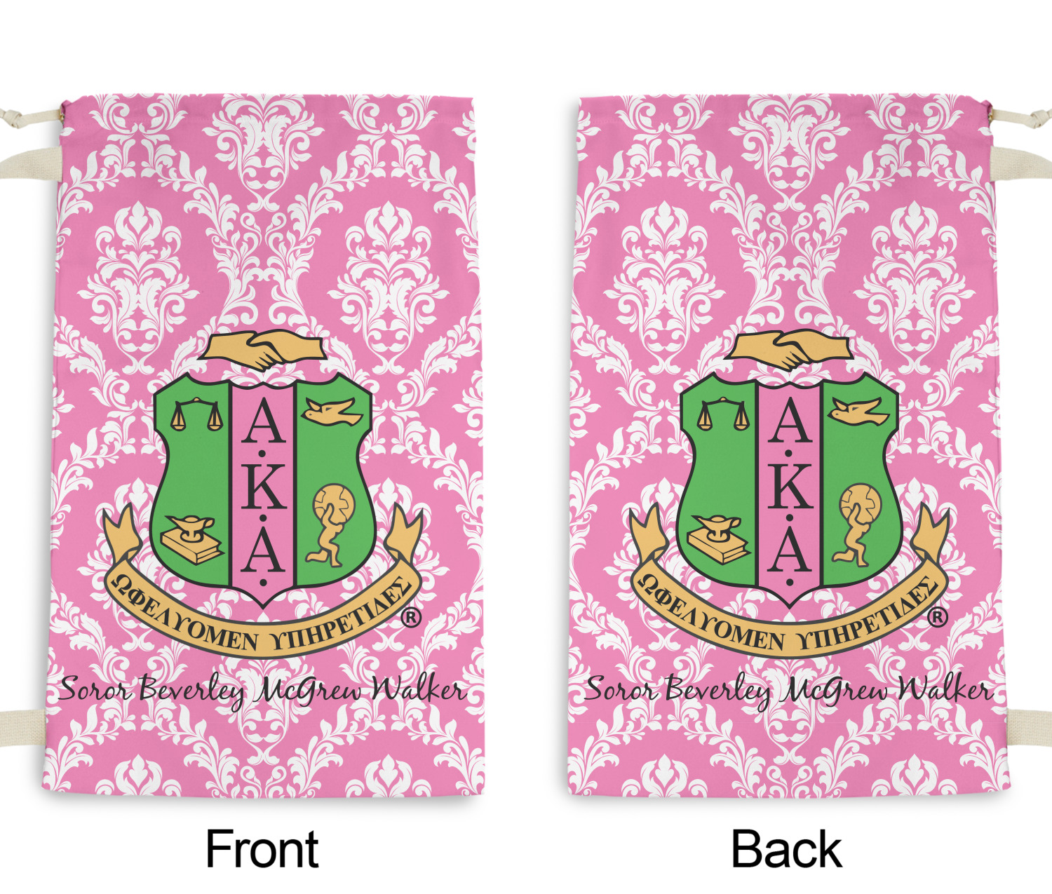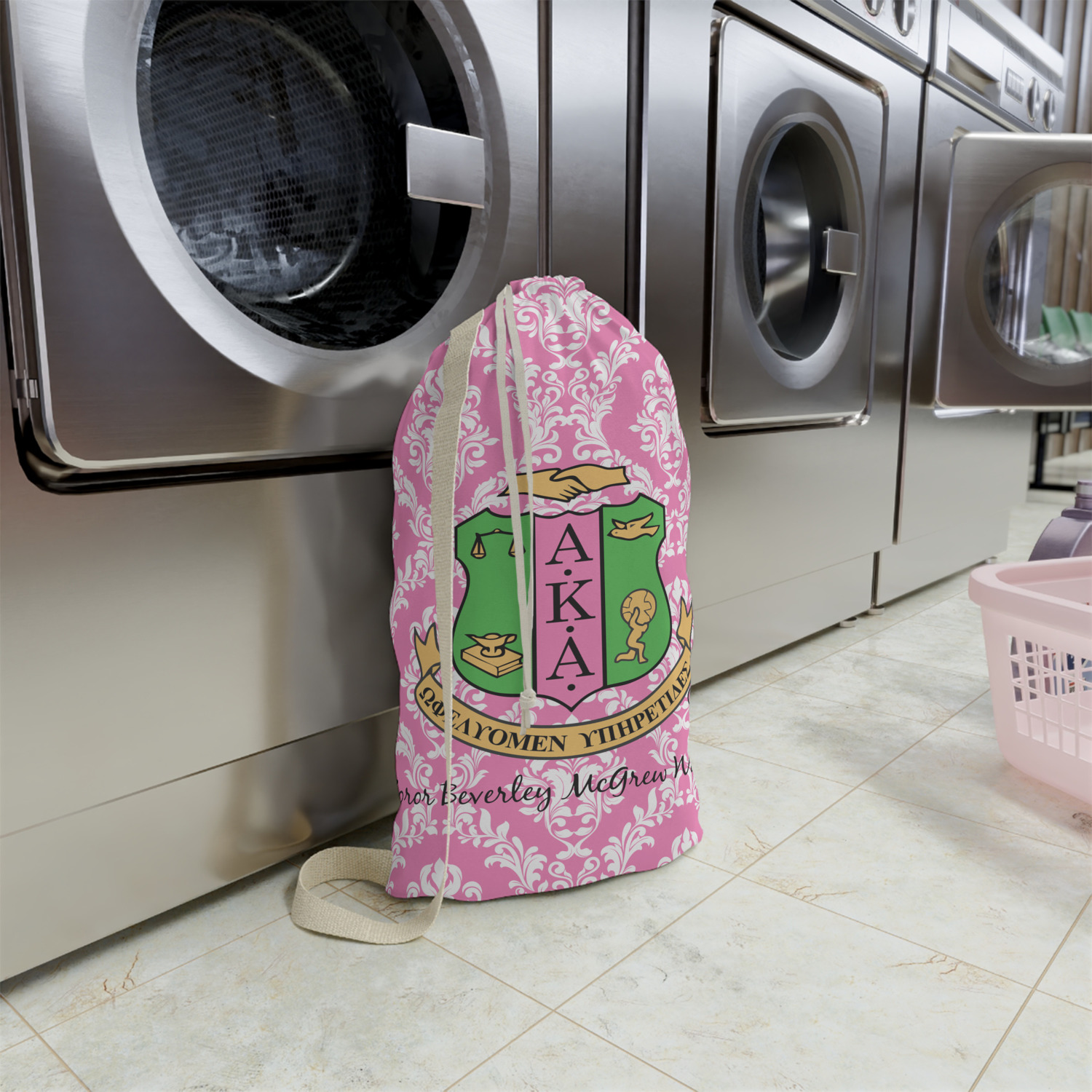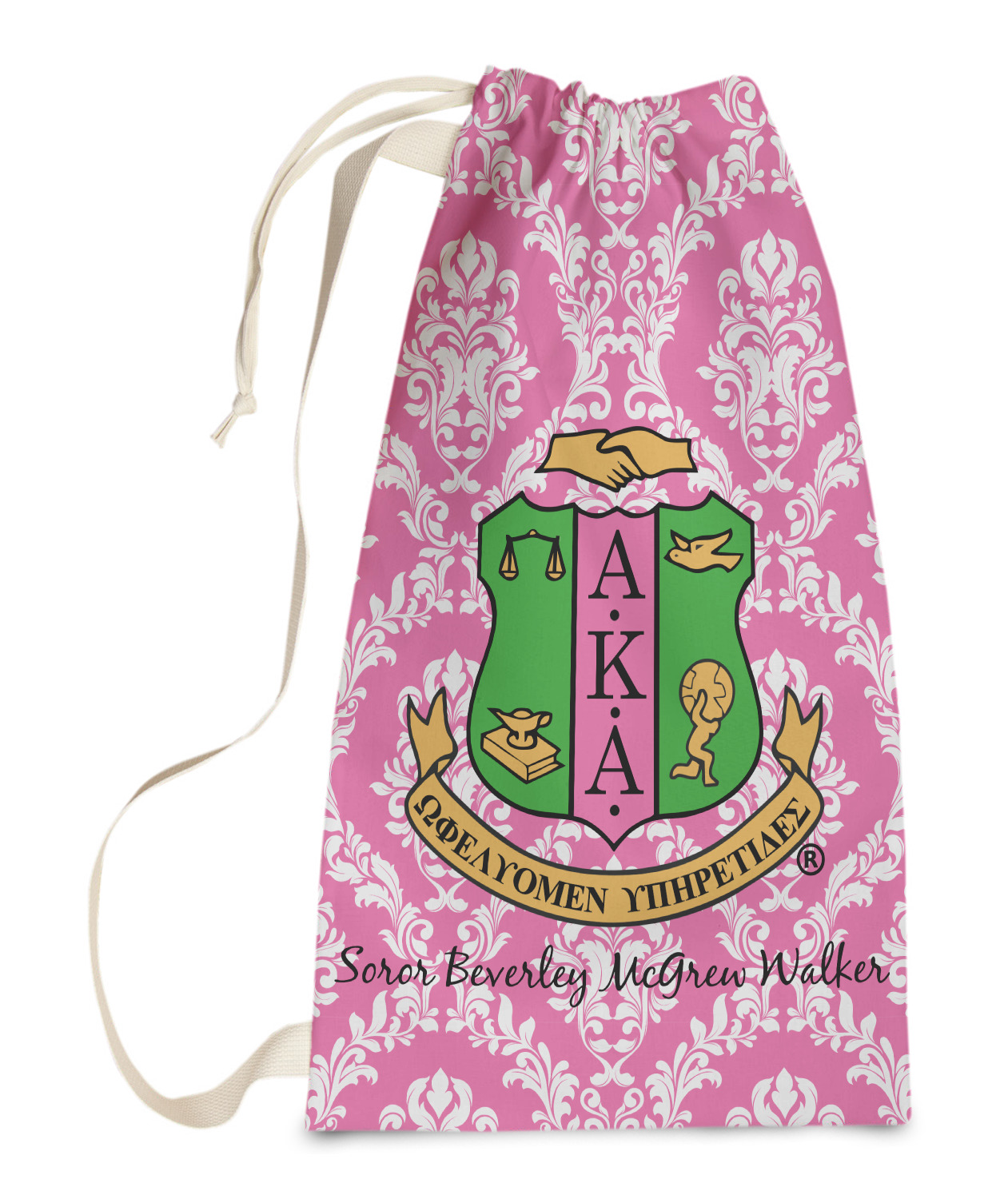 Carry your laundry in style with these customized laundry bags. Available in two sizes, featuring a natural colored woven strap and a cinch cord, these bags hold a lot of clothes or anything else you want to fit in them.