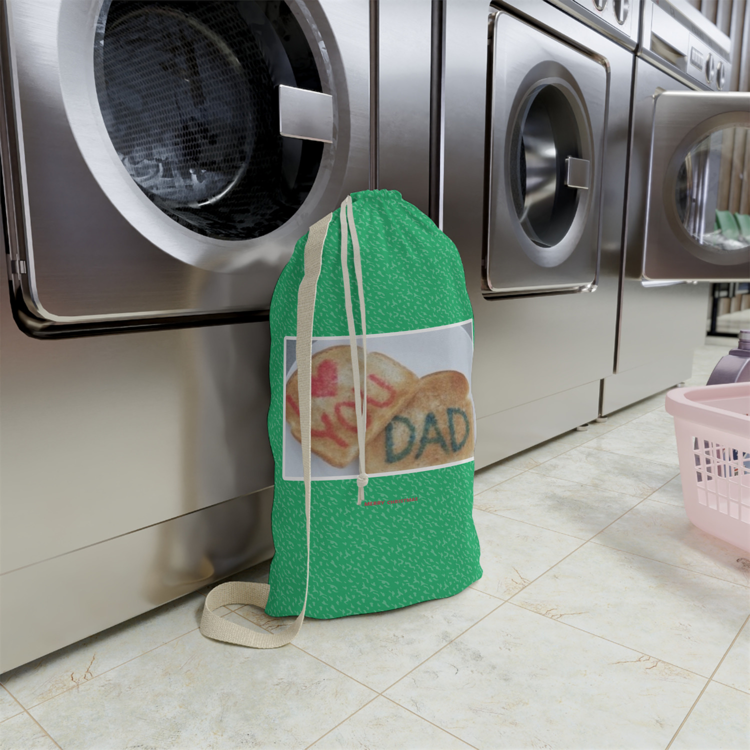Carry your laundry in style with these customized laundry bags. Available in two sizes, featuring a natural colored woven strap and a cinch cord, these bags hold a lot of clothes or anything else you want to fit in them.