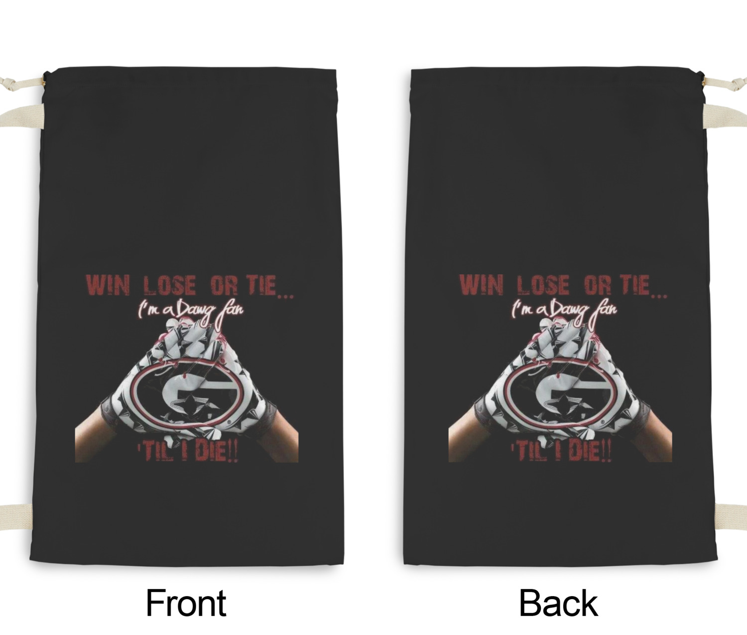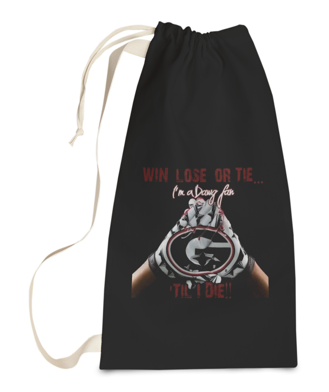 Carry your laundry in style with these customized laundry bags. Available in two sizes, featuring a natural colored woven strap and a cinch cord, these bags hold a lot of clothes or anything else you want to fit in them.