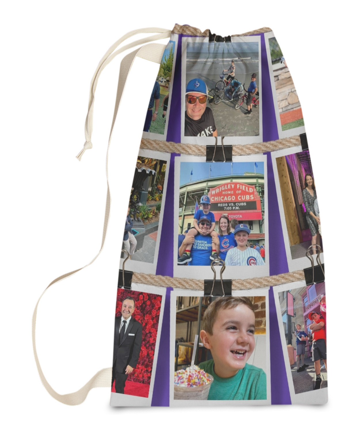 Carry your laundry in style with these customized laundry bags. Available in two sizes, featuring a natural colored woven strap and a cinch cord, these bags hold a lot of clothes or anything else you want to fit in them.