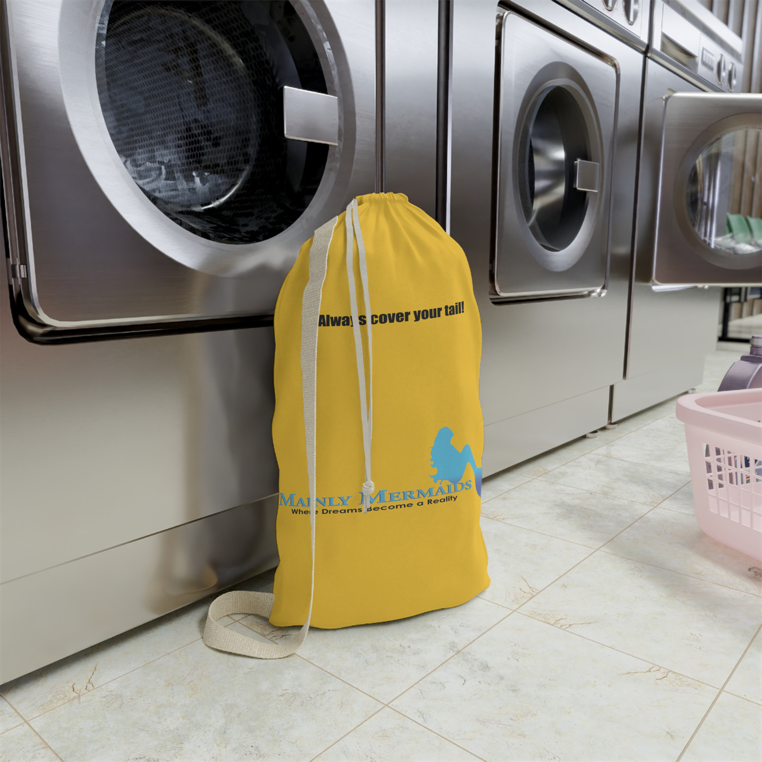 Carry your laundry in style with these customized laundry bags. Available in two sizes, featuring a natural colored woven strap and a cinch cord, these bags hold a lot of clothes or anything else you want to fit in them.