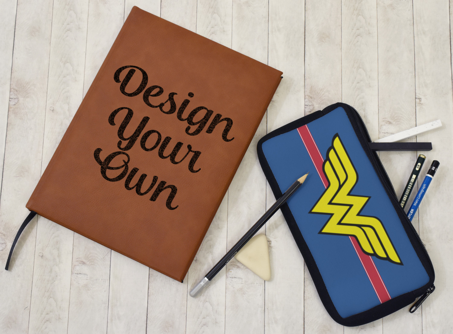 The faux leather covers are a rich cognac / rawhide color and can be customized with your design. From a simple name or monogram or a logo to a detailed mandala - the choice for customization & personalization is truly yours. Customize one of our designs or upload your own.