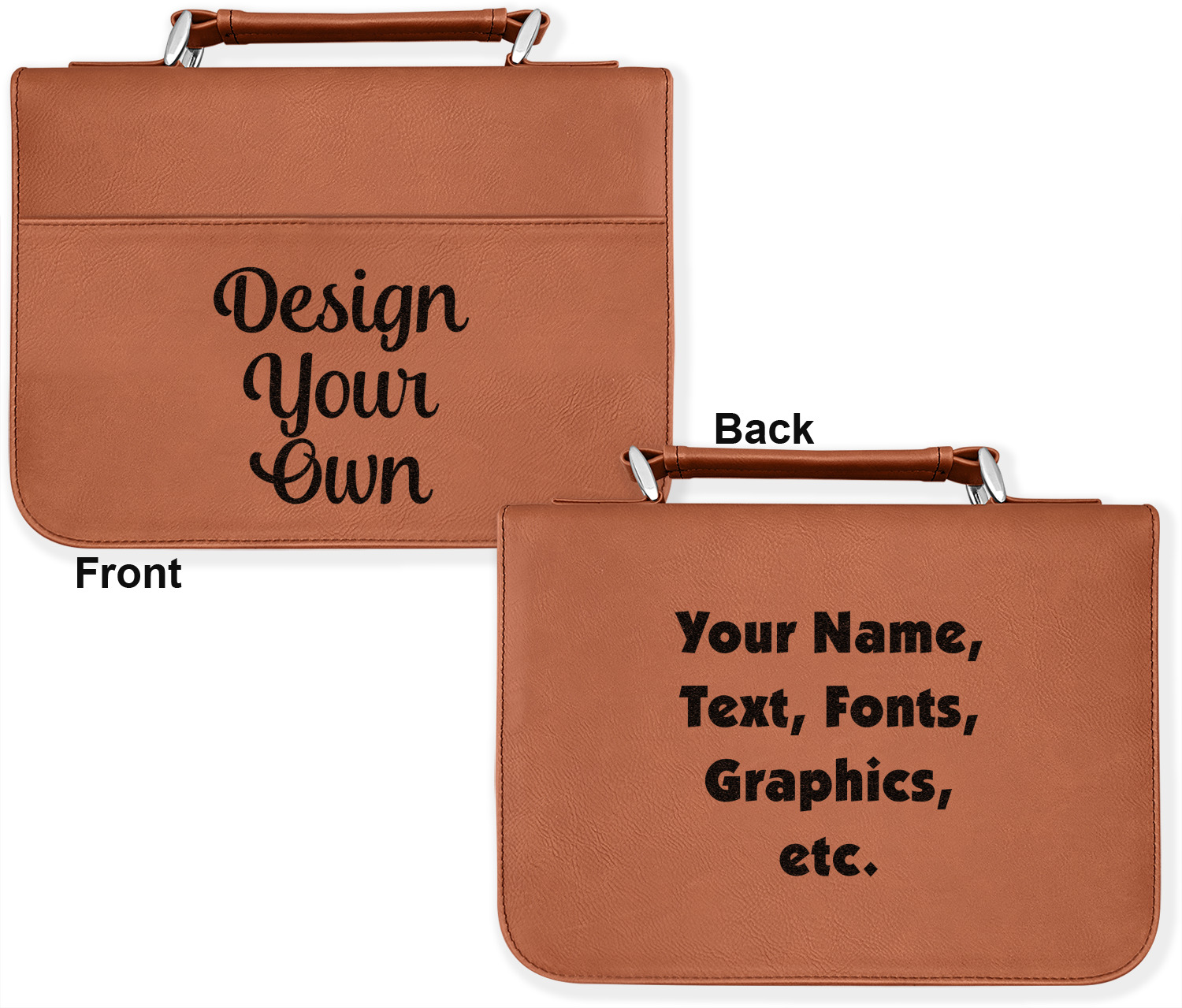 We offer these custom book covers in several variations. First, we offer two different sizes. Our small can accommodate books of up to 8.5" x 6" x 2". The larger size can fit books up to 10" x 7.125" x 2". Both of these sizes can then be customized according to your preference; you can either choose to laser engrave a design on the front and back, or solely the front.