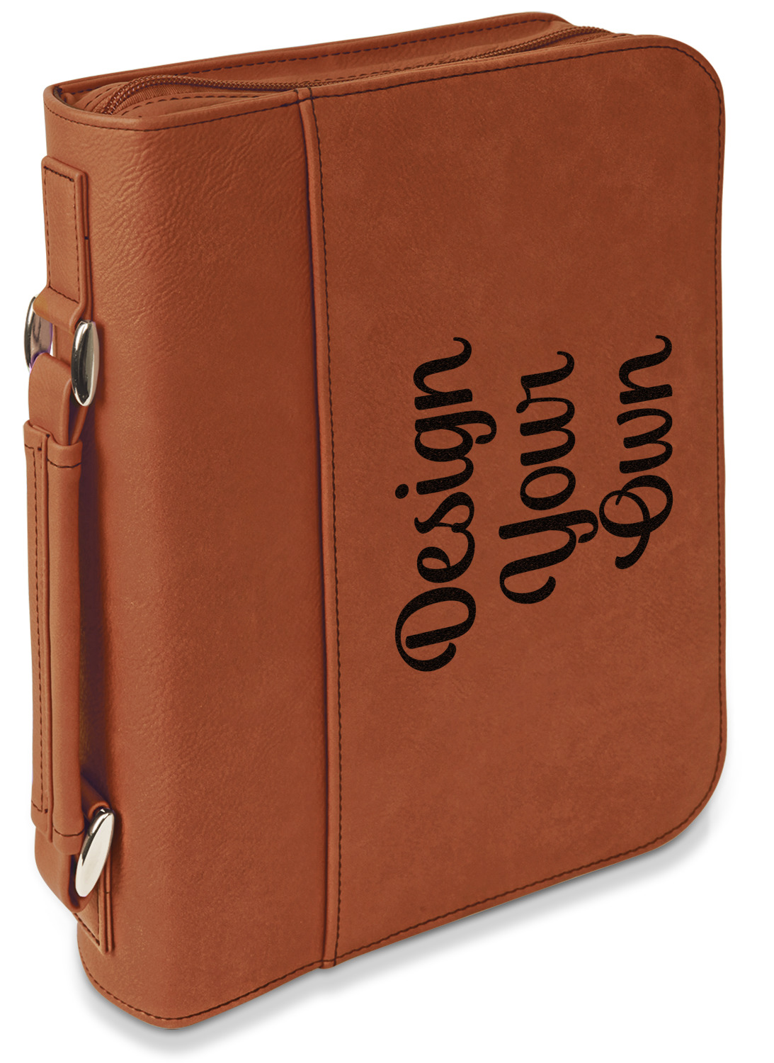 These book covers are fabricated from a fine leatherette in a warm, cognac shade of brown. A wide pocket spans across the front of the book jacket [2,400] and can store any loose papers or notes that you wish to keep. The interior of this personalized Bible cover includes slots on both sides to house the covers of your Bible, and keep it in place. The inside of the spine has a small elastic band to secure a pen. A zipper lines three sides of the cover, while the fourth side features a reinforced handle that allows for easy transport of your enclosed book.