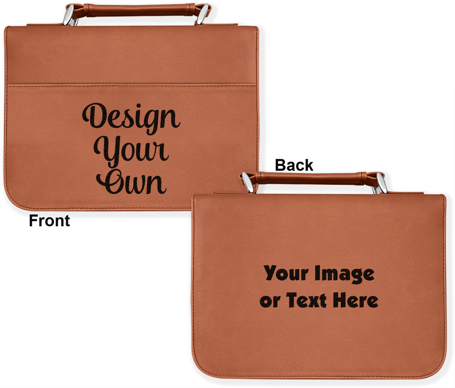 These book covers are fabricated from a fine leatherette in a warm, cognac shade of brown. A wide pocket spans across the front of the book jacket [2,400] and can store any loose papers or notes that you wish to keep. The interior of this personalized Bible cover includes slots on both sides to house the covers of your Bible, and keep it in place. The inside of the spine has a small elastic band to secure a pen. A zipper lines three sides of the cover, while the fourth side features a reinforced handle that allows for easy transport of your enclosed book.