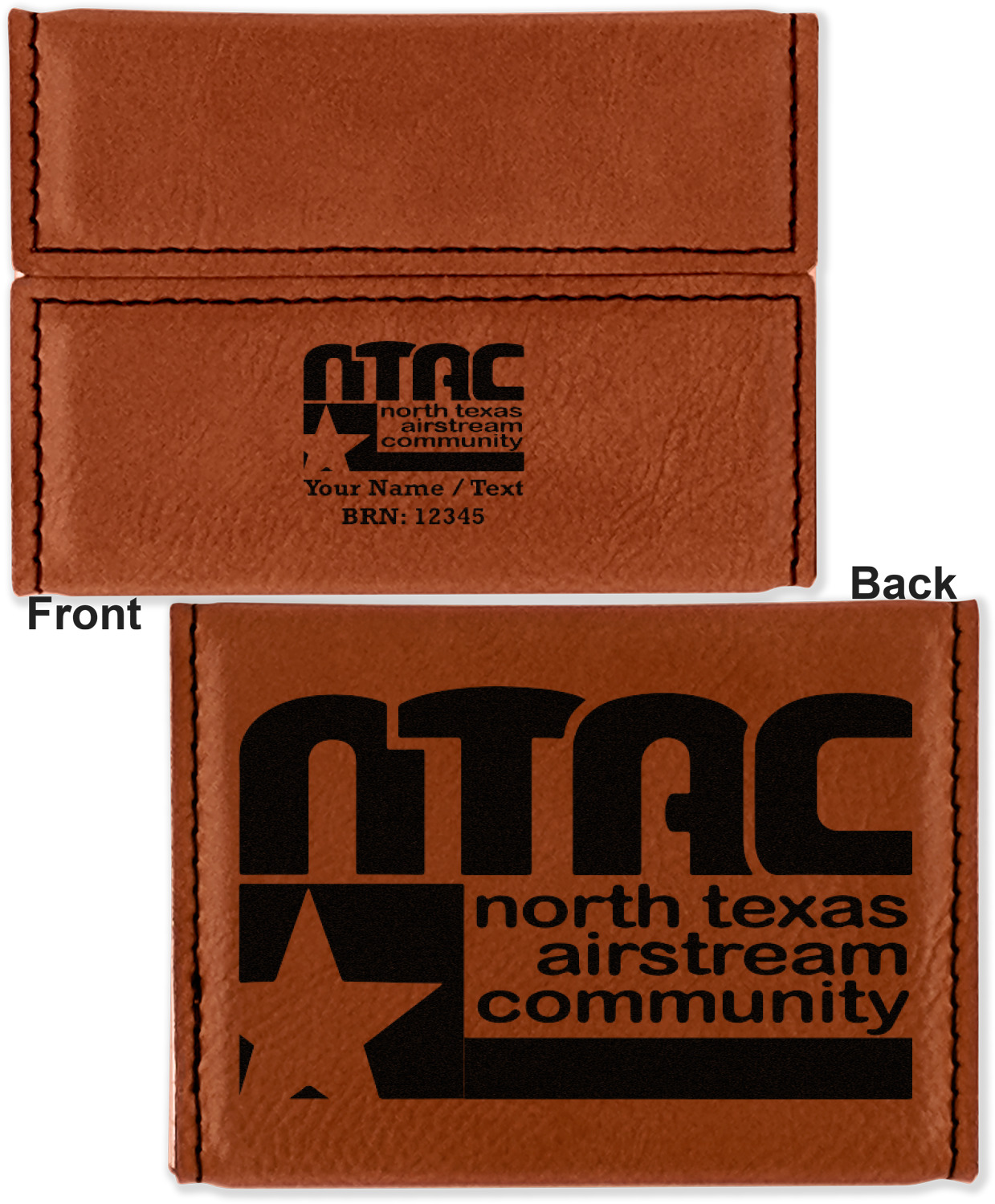Your personalized design is laser engraved onto either the front, or the front and back of the card holder, depending on the model you purchase. Once engraved, the design will appear a darkened black against the cognac color of the leatherette.