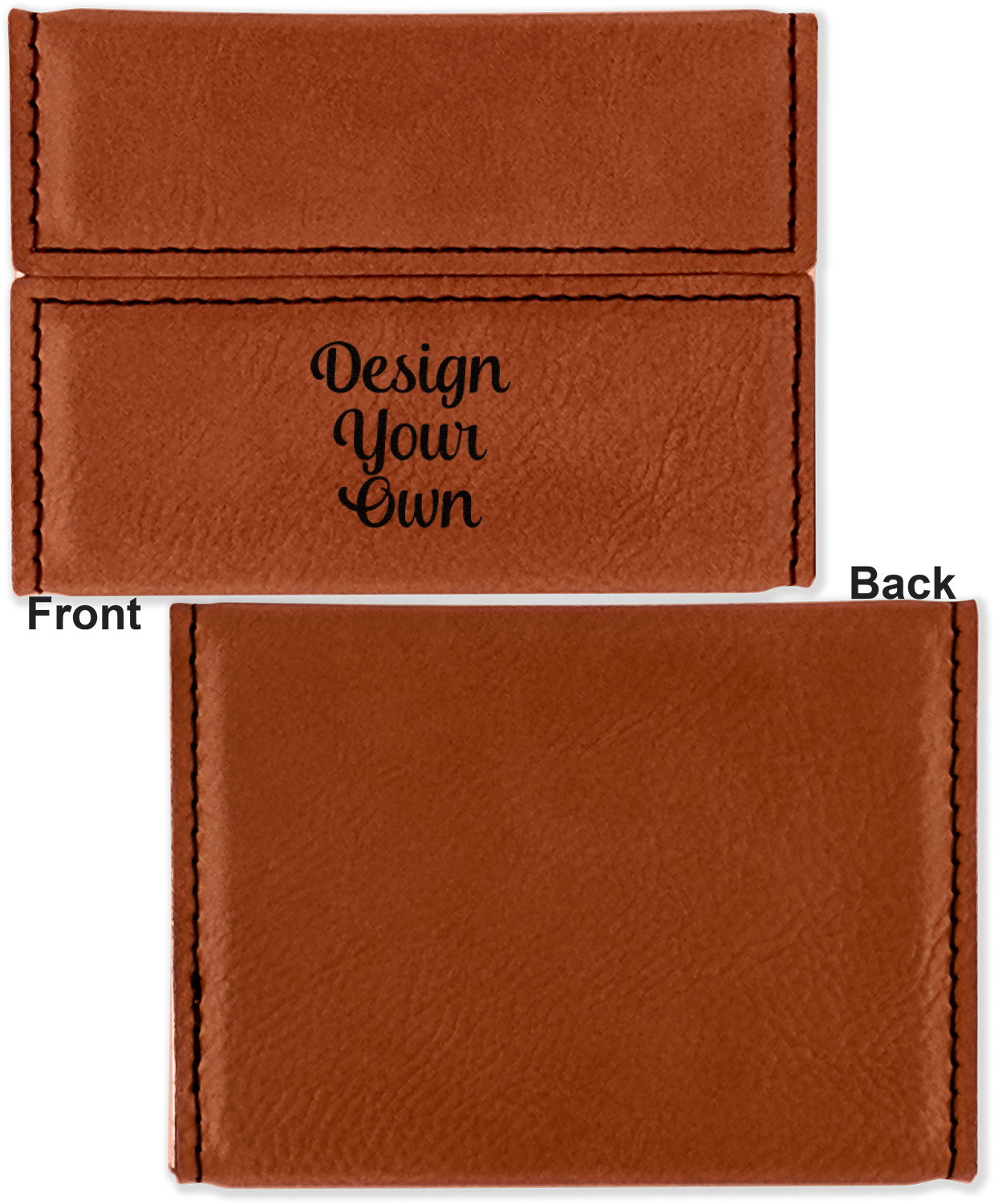 Your personalized design is laser engraved onto either the front, or the front and back of the card holder, depending on the model you purchase. Once engraved, the design will appear a darkened black against the cognac color of the leatherette.