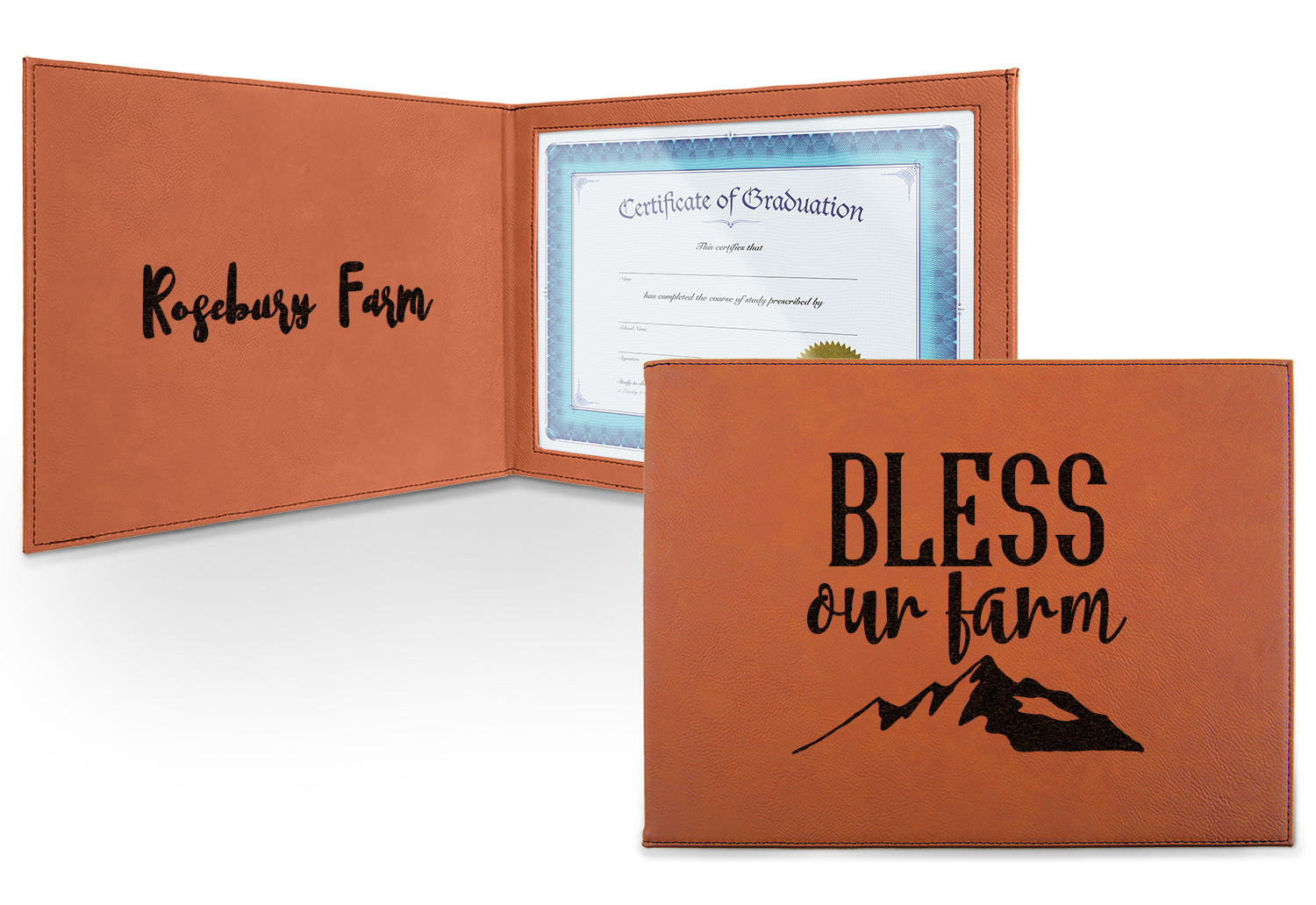 This cognac-colored, leatherette certificate jacket is the ideal way to display or store your hard-earned certificate. When closed, the custom certificate holder measures at 12 by 9 inches. The interior of the certificate cover includes a clear, vinyl window to encase your diploma. The window measures at around 10.5 by 7.5 inches and can accommodate a diploma that measures at up to 8.5 by 11 inches. You can either choose to have your customization laser engraved on the front and interior, or solely the front.
