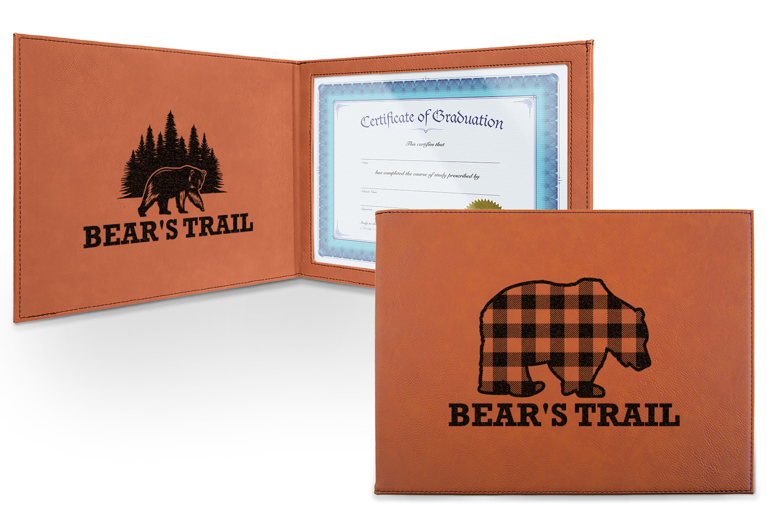 This cognac-colored, leatherette certificate jacket is the ideal way to display or store your hard-earned certificate. When closed, the custom certificate holder measures at 12 by 9 inches. The interior of the certificate cover includes a clear, vinyl window to encase your diploma. The window measures at around 10.5 by 7.5 inches and can accommodate a diploma that measures at up to 8.5 by 11 inches. You can either choose to have your customization laser engraved on the front and interior, or solely the front.