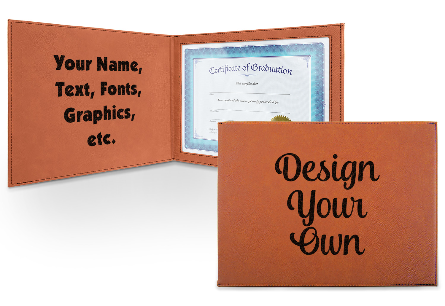 This cognac-colored, leatherette certificate jacket is the ideal way to display or store your hard-earned certificate. When closed, the custom certificate holder measures at 12 by 9 inches. The interior of the certificate cover includes a clear, vinyl window to encase your diploma. The window measures at around 10.5 by 7.5 inches and can accommodate a diploma that measures at up to 8.5 by 11 inches. You can either choose to have your customization laser engraved on the front and interior, or solely the front.