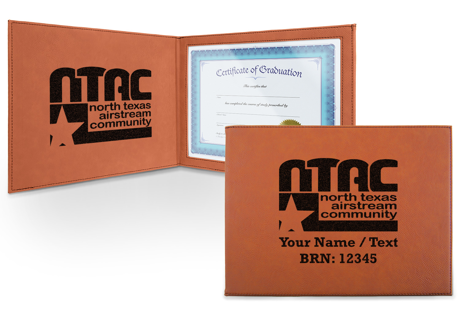 This cognac-colored, leatherette certificate jacket is the ideal way to display or store your hard-earned certificate. When closed, the custom certificate holder measures at 12 by 9 inches. The interior of the certificate cover includes a clear, vinyl window to encase your diploma. The window measures at around 10.5 by 7.5 inches and can accommodate a diploma that measures at up to 8.5 by 11 inches. You can either choose to have your customization laser engraved on the front and interior, or solely the front.