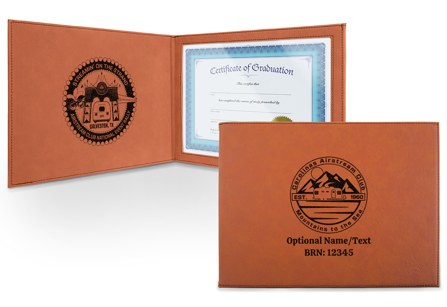 This cognac-colored, leatherette certificate jacket is the ideal way to display or store your hard-earned certificate. When closed, the custom certificate holder measures at 12 by 9 inches. The interior of the certificate cover includes a clear, vinyl window to encase your diploma. The window measures at around 10.5 by 7.5 inches and can accommodate a diploma that measures at up to 8.5 by 11 inches. You can either choose to have your customization laser engraved on the front and interior, or solely the front.