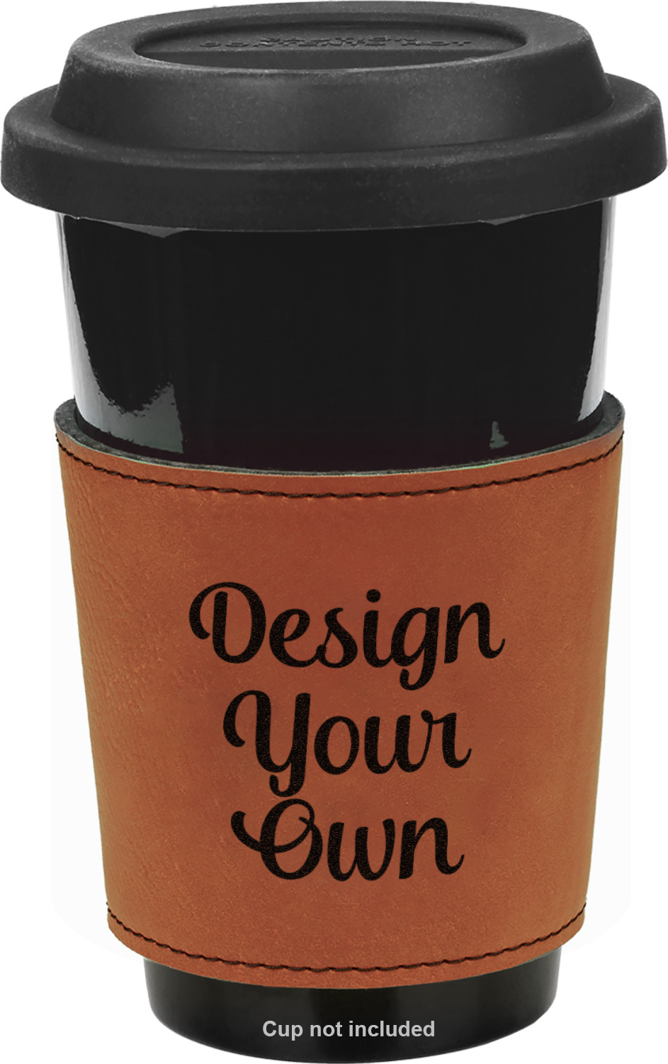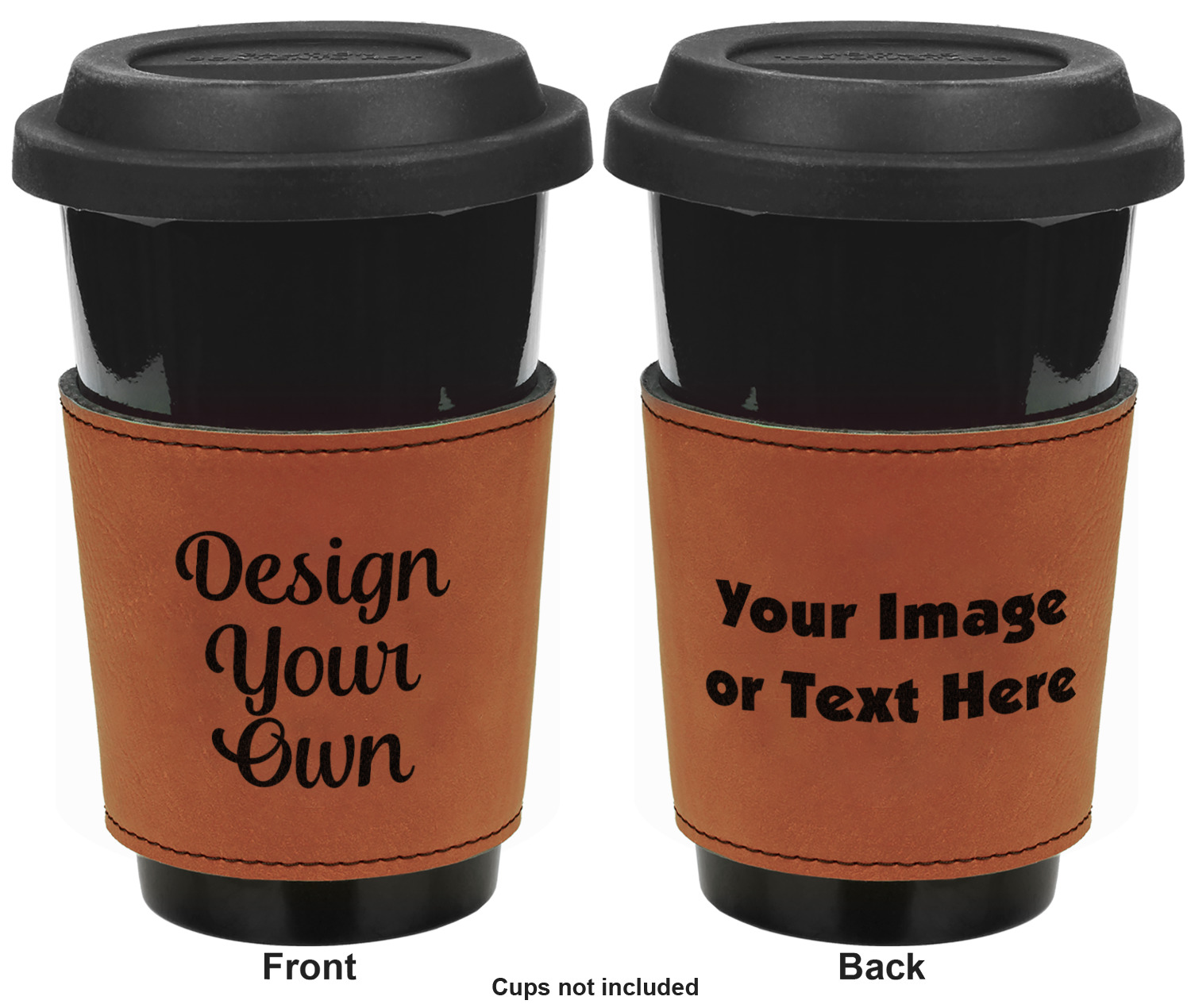 This cup sleeve is made from a suave, cognac-brown leatherette and finished with an intricate, black stitch. The interior of this can sleeve is fabricated from a thin foam material to help insulate your mug's contents. The sleeve is specifically made to suit tapered glasses or mugs, so the top's diameter is 3.5 inches, while the bottom's diameter is 2.75 inches. Your customized design will be laser engraved into the leatherette, leaving behind crisp, black imprint. With these products, we provide you with the option of engraving the front and back, or the front only.