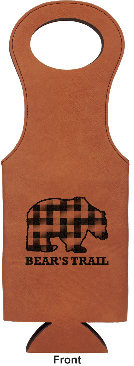 This wine carrier is made from a stunning leatherette, in a cognac-brown color. Strong, black stitching lines the sides of your wine bottle bag and provides extra durability. The interior is lined with a padded, black material to allow for a snug fit once your bottle is placed inside. At the top of this wine gift bag, you'll find two oval shaped handles that elegantly complements the rest of the bag's style. We provide you with the option of laser-engraving the front, or the front and back of your new personalized wine bag!