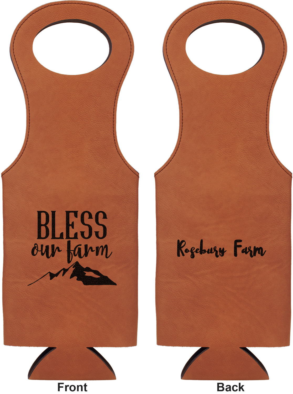 This wine carrier is made from a stunning leatherette, in a cognac-brown color. Strong, black stitching lines the sides of your wine bottle bag and provides extra durability. The interior is lined with a padded, black material to allow for a snug fit once your bottle is placed inside. At the top of this wine gift bag, you'll find two oval shaped handles that elegantly complements the rest of the bag's style. We provide you with the option of laser-engraving the front, or the front and back of your new personalized wine bag!