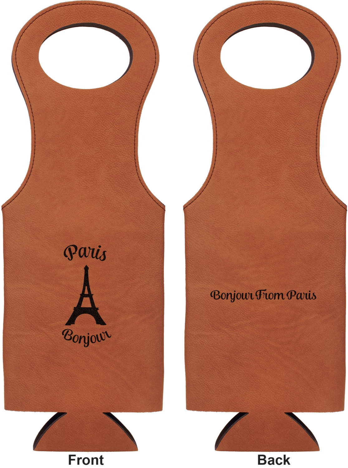 This wine carrier is made from a stunning leatherette, in a cognac-brown color. Strong, black stitching lines the sides of your wine bottle bag and provides extra durability. The interior is lined with a padded, black material to allow for a snug fit once your bottle is placed inside. At the top of this wine gift bag, you'll find two oval shaped handles that elegantly complements the rest of the bag's style. We provide you with the option of laser-engraving the front, or the front and back of your new personalized wine bag!