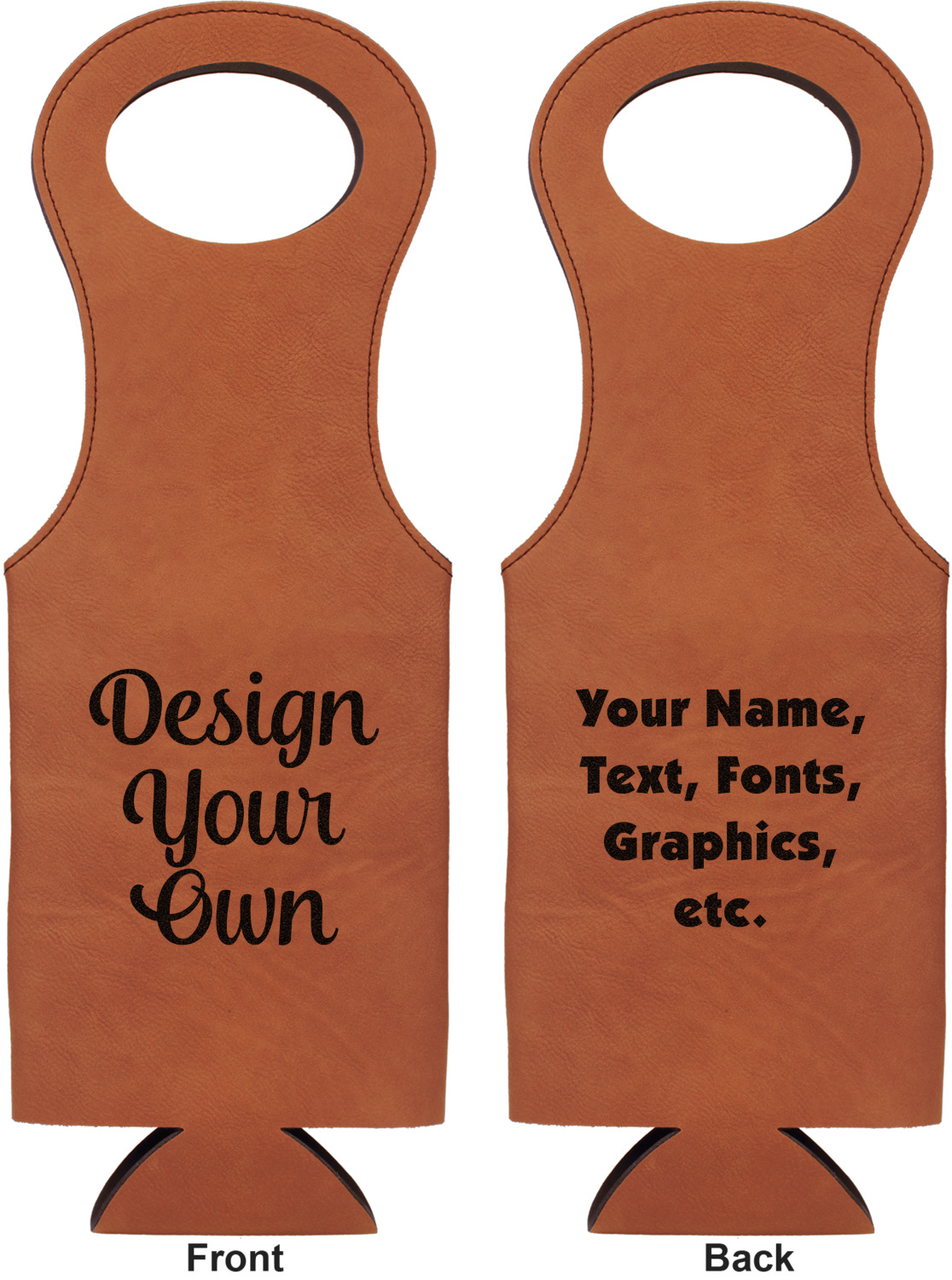 This wine carrier is made from a stunning leatherette, in a cognac-brown color. Strong, black stitching lines the sides of your wine bottle bag and provides extra durability. The interior is lined with a padded, black material to allow for a snug fit once your bottle is placed inside. At the top of this wine gift bag, you'll find two oval shaped handles that elegantly complements the rest of the bag's style. We provide you with the option of laser-engraving the front, or the front and back of your new personalized wine bag!