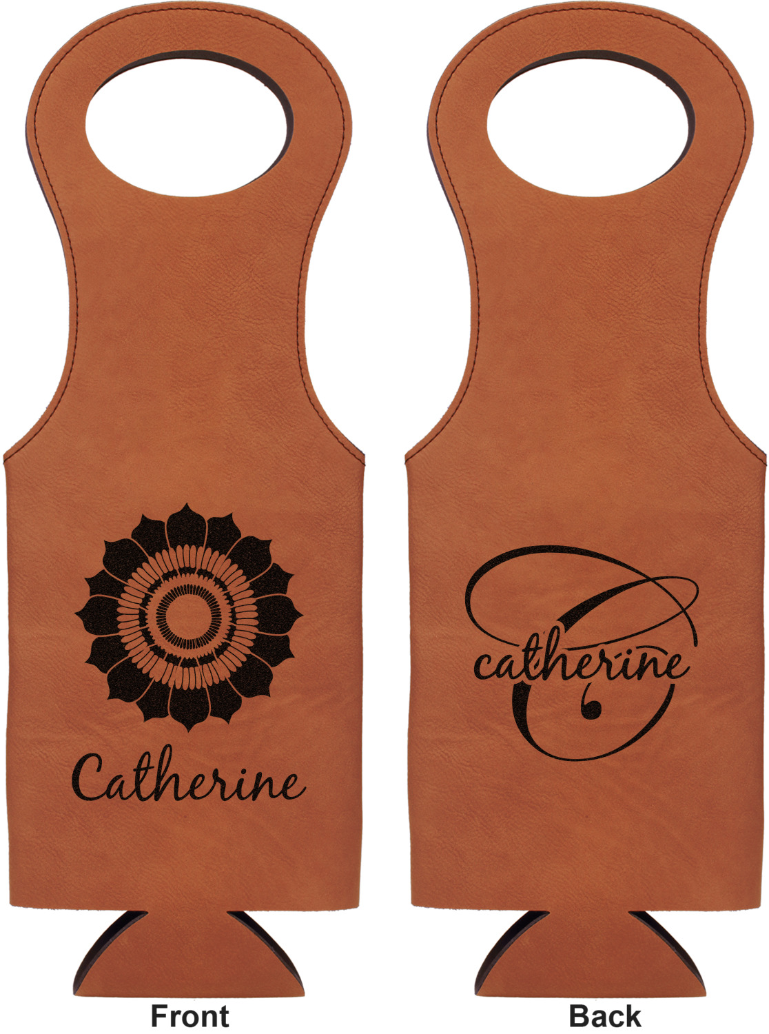 This wine carrier is made from a stunning leatherette, in a cognac-brown color. Strong, black stitching lines the sides of your wine bottle bag and provides extra durability. The interior is lined with a padded, black material to allow for a snug fit once your bottle is placed inside. At the top of this wine gift bag, you'll find two oval shaped handles that elegantly complements the rest of the bag's style. We provide you with the option of laser-engraving the front, or the front and back of your new personalized wine bag!