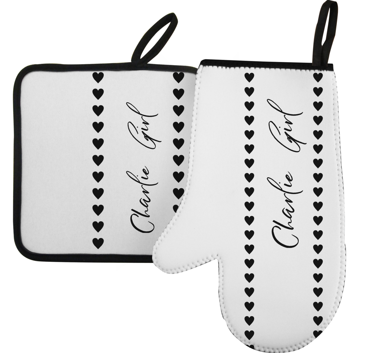 Along with our heat resistant gloves, we also carry personalized pot holders. These pot holders also feature a neoprene front that displays your personalization, and a textured, rubber backing for a sturdy grip. The two materials are connected with a sleek, black trim, and the hot pot holder also includes an attached loop for hanging and storage. You can purchase a kitchen pot holder by itself, or alongside a right or left oven mitt, depending on your needs. The pot holder itself is approximately 8.75 inches by 8.75 inches and 0.25 inches tall.