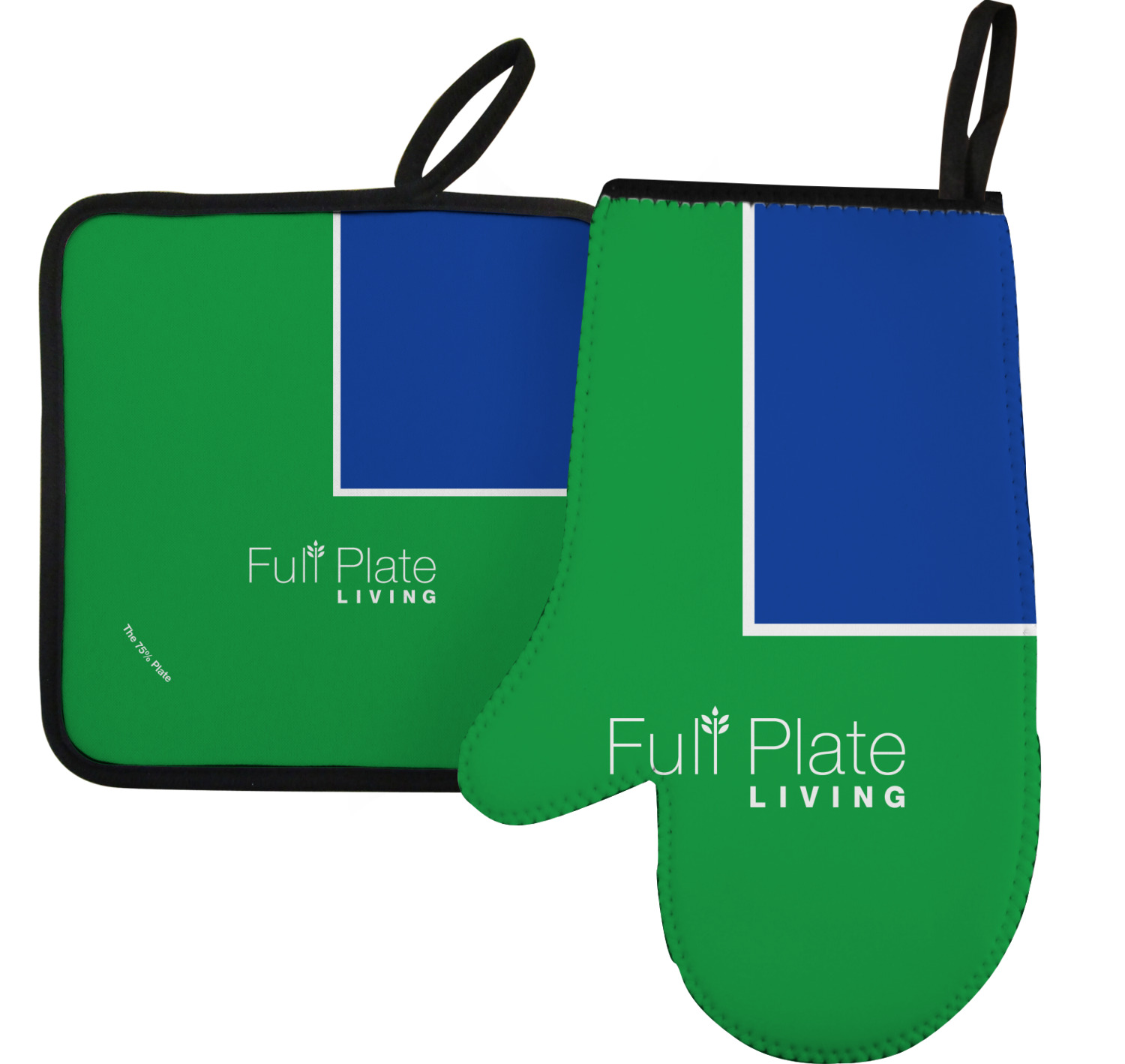 Along with our heat resistant gloves, we also carry personalized pot holders. These pot holders also feature a neoprene front that displays your personalization, and a textured, rubber backing for a sturdy grip. The two materials are connected with a sleek, black trim, and the hot pot holder also includes an attached loop for hanging and storage. You can purchase a kitchen pot holder by itself, or alongside a right or left oven mitt, depending on your needs. The pot holder itself is approximately 8.75 inches by 8.75 inches and 0.25 inches tall.