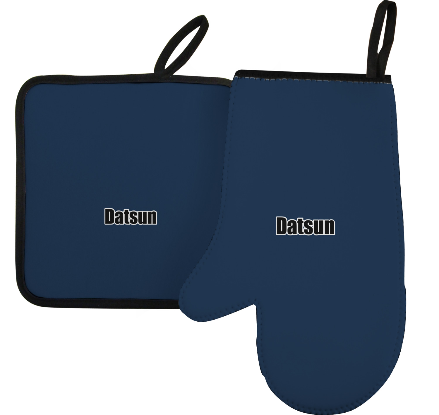Along with our heat resistant gloves, we also carry personalized pot holders. These pot holders also feature a neoprene front that displays your personalization, and a textured, rubber backing for a sturdy grip. The two materials are connected with a sleek, black trim, and the hot pot holder also includes an attached loop for hanging and storage. You can purchase a kitchen pot holder by itself, or alongside a right or left oven mitt, depending on your needs. The pot holder itself is approximately 8.75 inches by 8.75 inches and 0.25 inches tall.