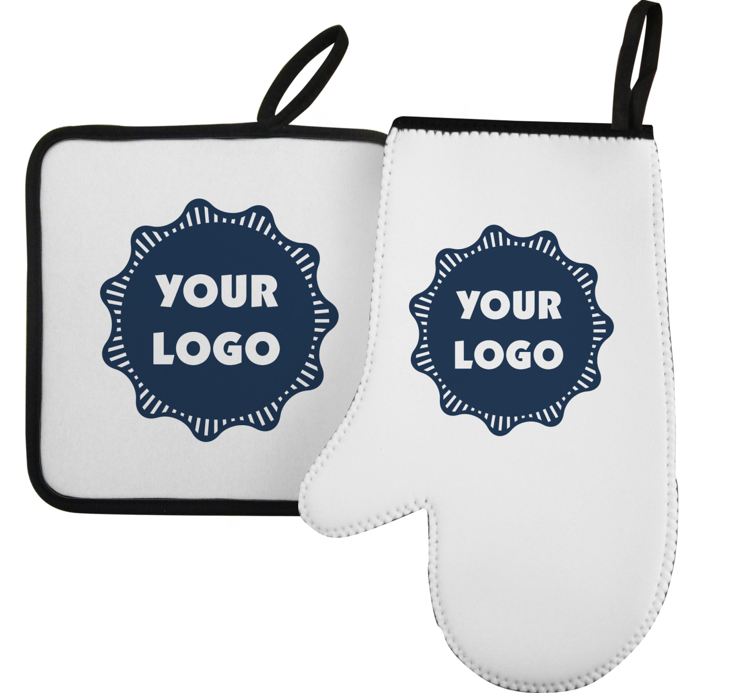 Along with our heat resistant gloves, we also carry personalized pot holders. These pot holders also feature a neoprene front that displays your personalization, and a textured, rubber backing for a sturdy grip. The two materials are connected with a sleek, black trim, and the hot pot holder also includes an attached loop for hanging and storage. You can purchase a kitchen pot holder by itself, or alongside a right or left oven mitt, depending on your needs. The pot holder itself is approximately 8.75 inches by 8.75 inches and 0.25 inches tall.