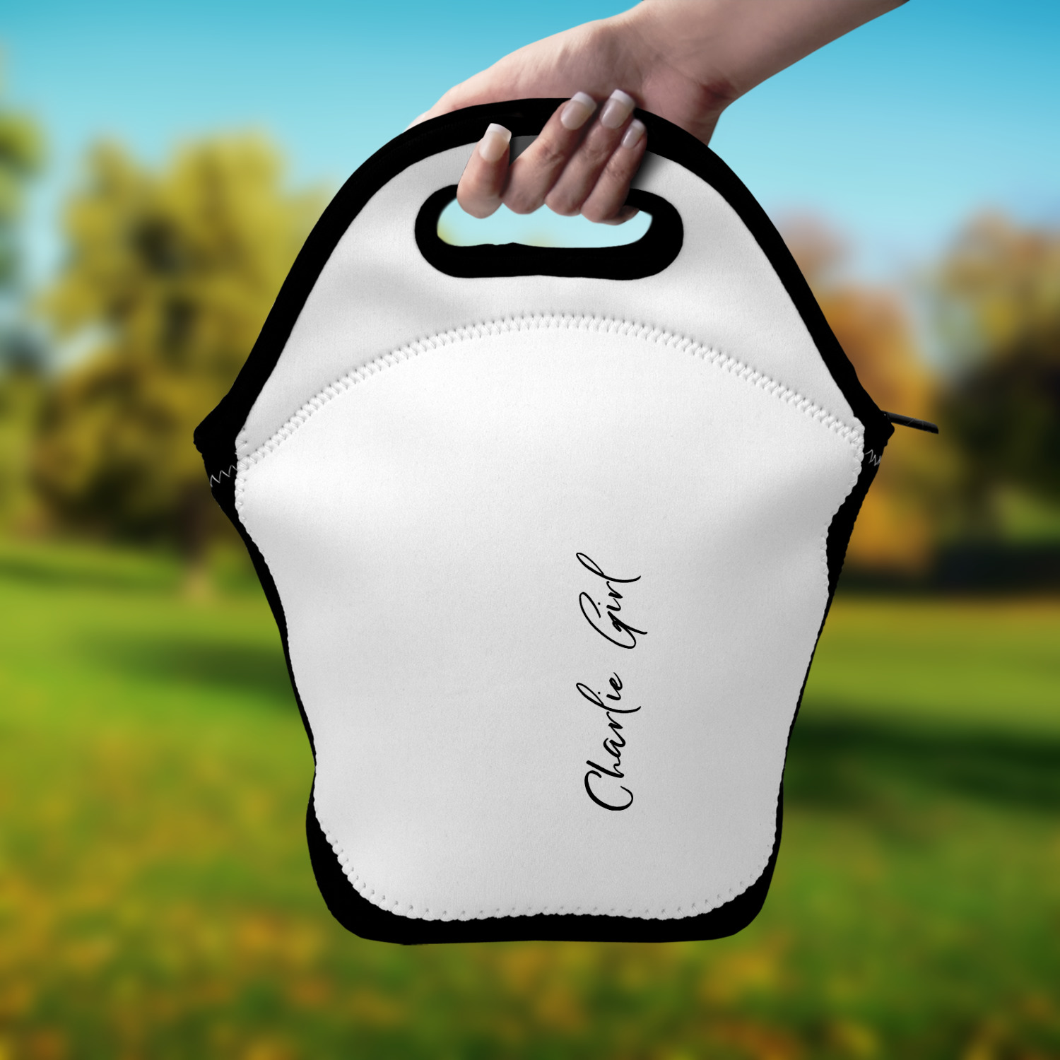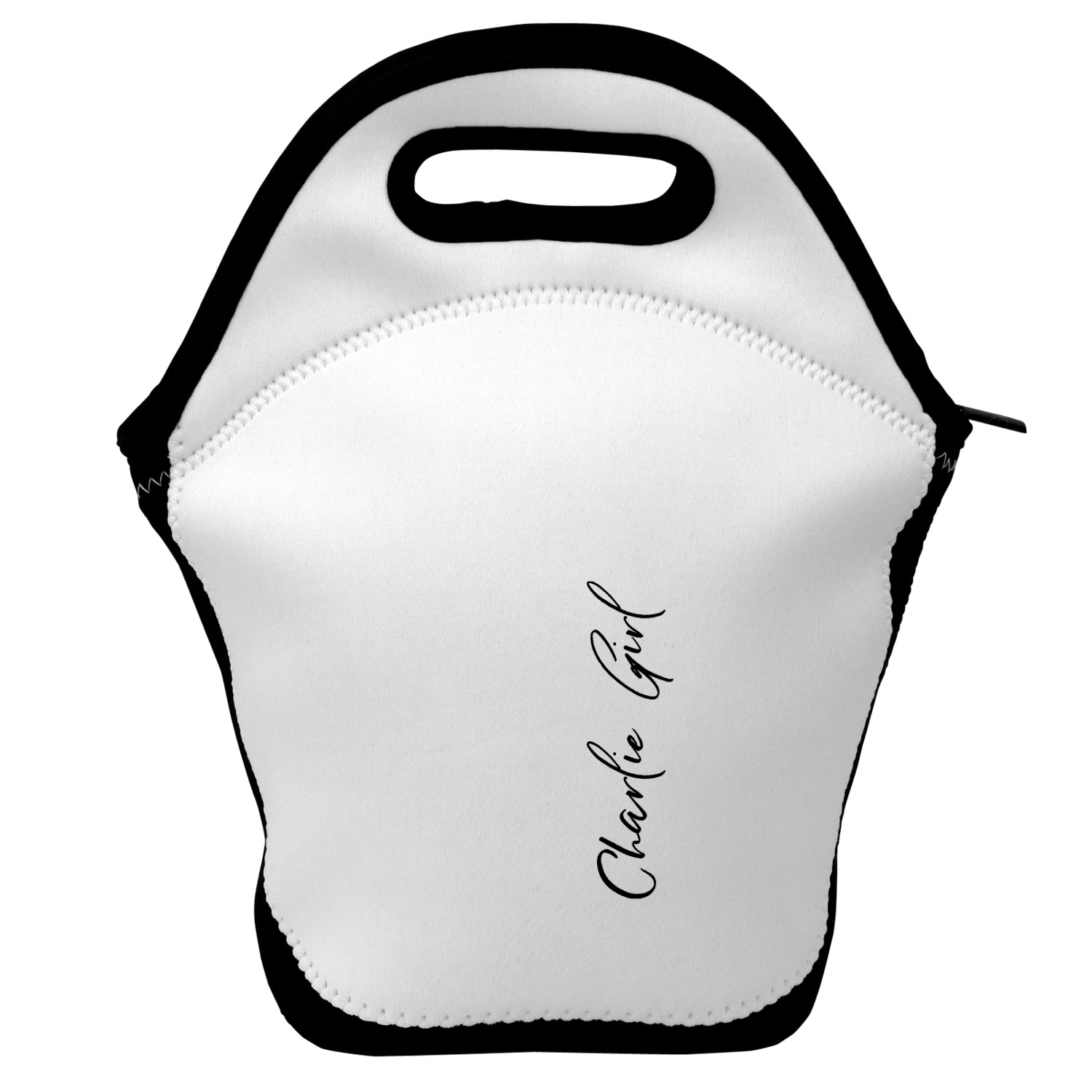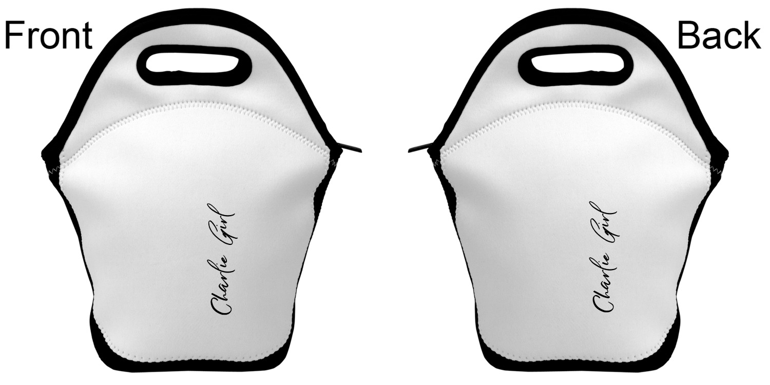 Our personalized lunch bags are made from a strong neoprene, and secure with a zipper closure that lines the top of the bag.The edges of the neoprene are sewn together with a heavy duty stitch, adding to the durability of the bag. The is accompanied by a reinforced handle at its top, for the easy transport of your lunch. We display your personalization across both the front and back of this neoprene lunch bag, while the remaining sides are a sleek black in color. Each bag measures at 13.5 inches tall, and 11.5 inches wide.