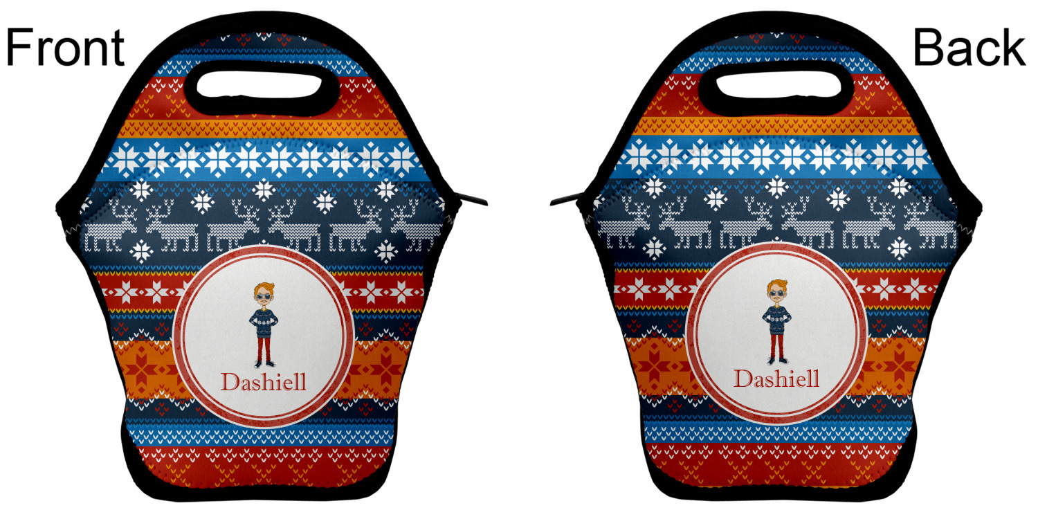 Our personalized lunch bags are made from a strong neoprene, and secure with a zipper closure that lines the top of the bag.The edges of the neoprene are sewn together with a heavy duty stitch, adding to the durability of the bag. The is accompanied by a reinforced handle at its top, for the easy transport of your lunch. We display your personalization across both the front and back of this neoprene lunch bag, while the remaining sides are a sleek black in color. Each bag measures at 13.5 inches tall, and 11.5 inches wide.
