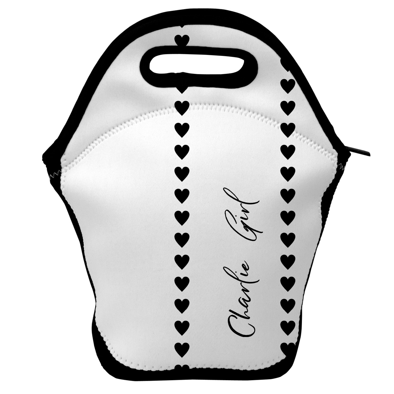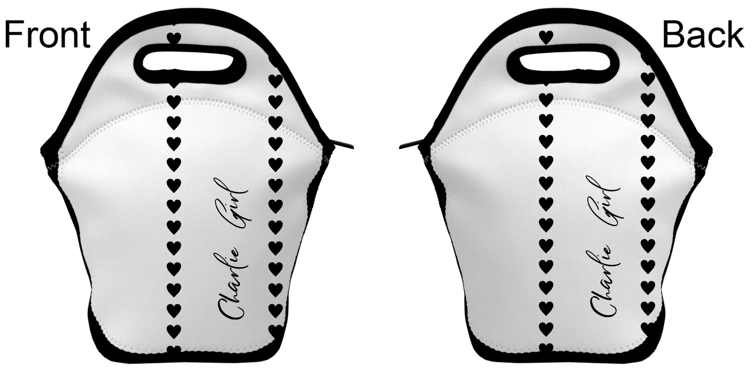 Our personalized lunch bags are made from a strong neoprene, and secure with a zipper closure that lines the top of the bag.The edges of the neoprene are sewn together with a heavy duty stitch, adding to the durability of the bag. The is accompanied by a reinforced handle at its top, for the easy transport of your lunch. We display your personalization across both the front and back of this neoprene lunch bag, while the remaining sides are a sleek black in color. Each bag measures at 13.5 inches tall, and 11.5 inches wide.