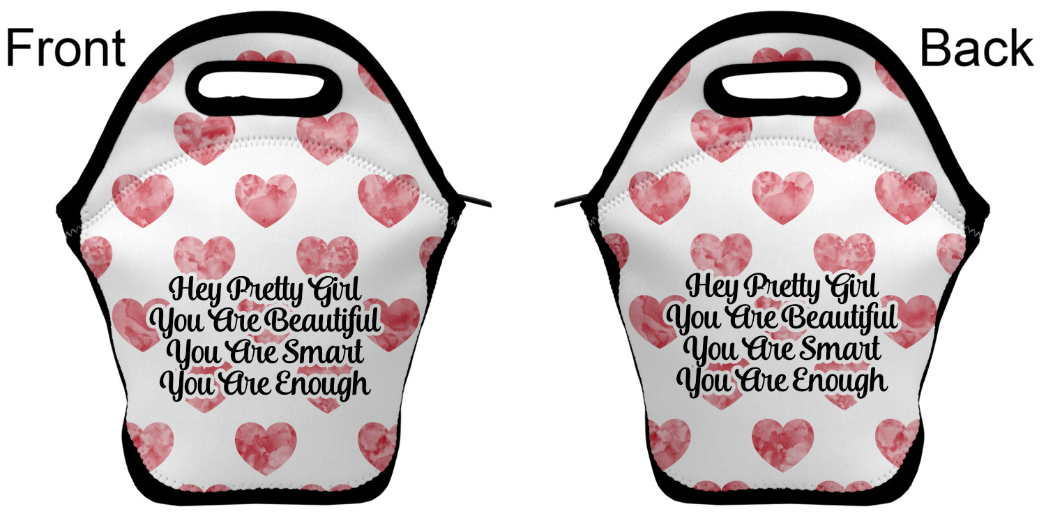 Our personalized lunch bags are made from a strong neoprene, and secure with a zipper closure that lines the top of the bag.The edges of the neoprene are sewn together with a heavy duty stitch, adding to the durability of the bag. The is accompanied by a reinforced handle at its top, for the easy transport of your lunch. We display your personalization across both the front and back of this neoprene lunch bag, while the remaining sides are a sleek black in color. Each bag measures at 13.5 inches tall, and 11.5 inches wide.