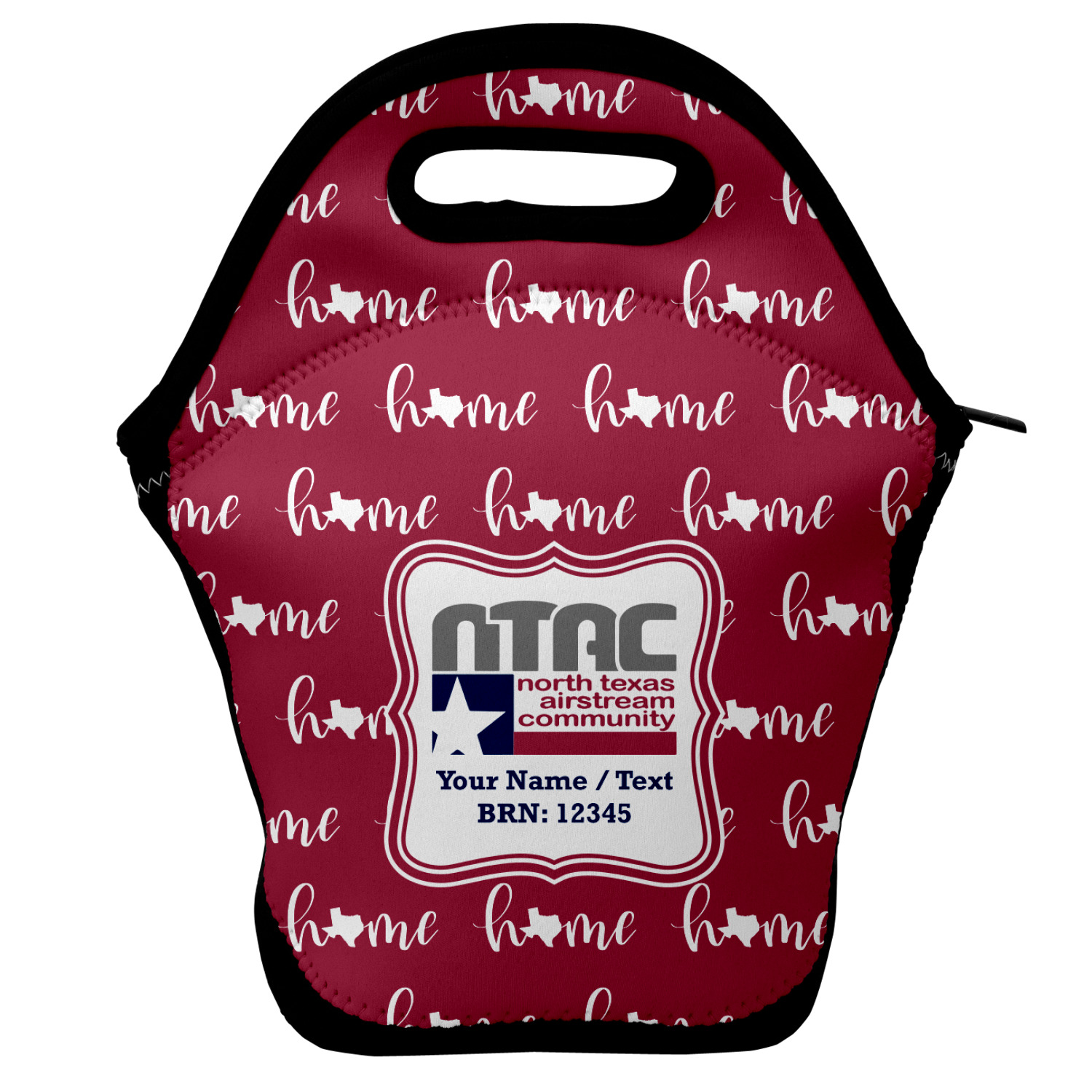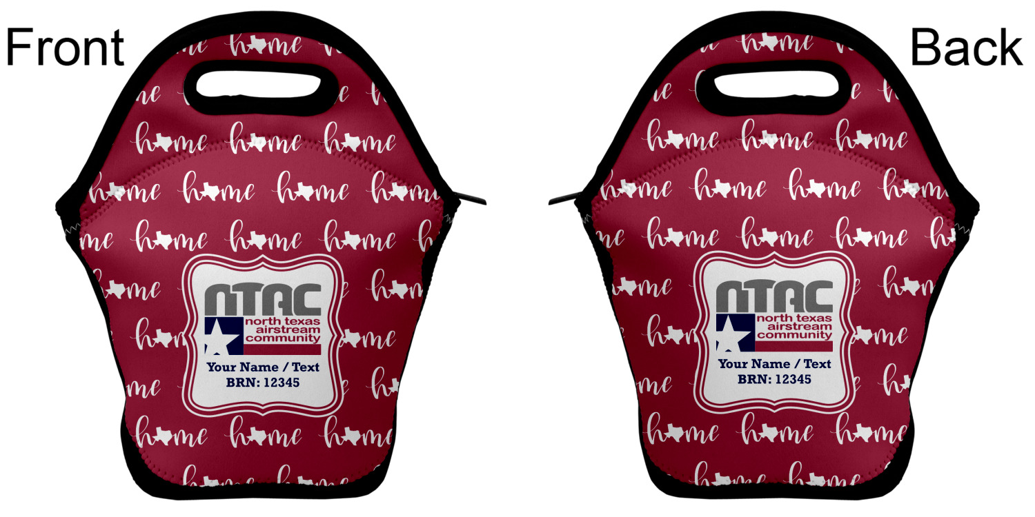 Our personalized lunch bags are made from a strong neoprene, and secure with a zipper closure that lines the top of the bag.The edges of the neoprene are sewn together with a heavy duty stitch, adding to the durability of the bag. The is accompanied by a reinforced handle at its top, for the easy transport of your lunch. We display your personalization across both the front and back of this neoprene lunch bag, while the remaining sides are a sleek black in color. Each bag measures at 13.5 inches tall, and 11.5 inches wide.