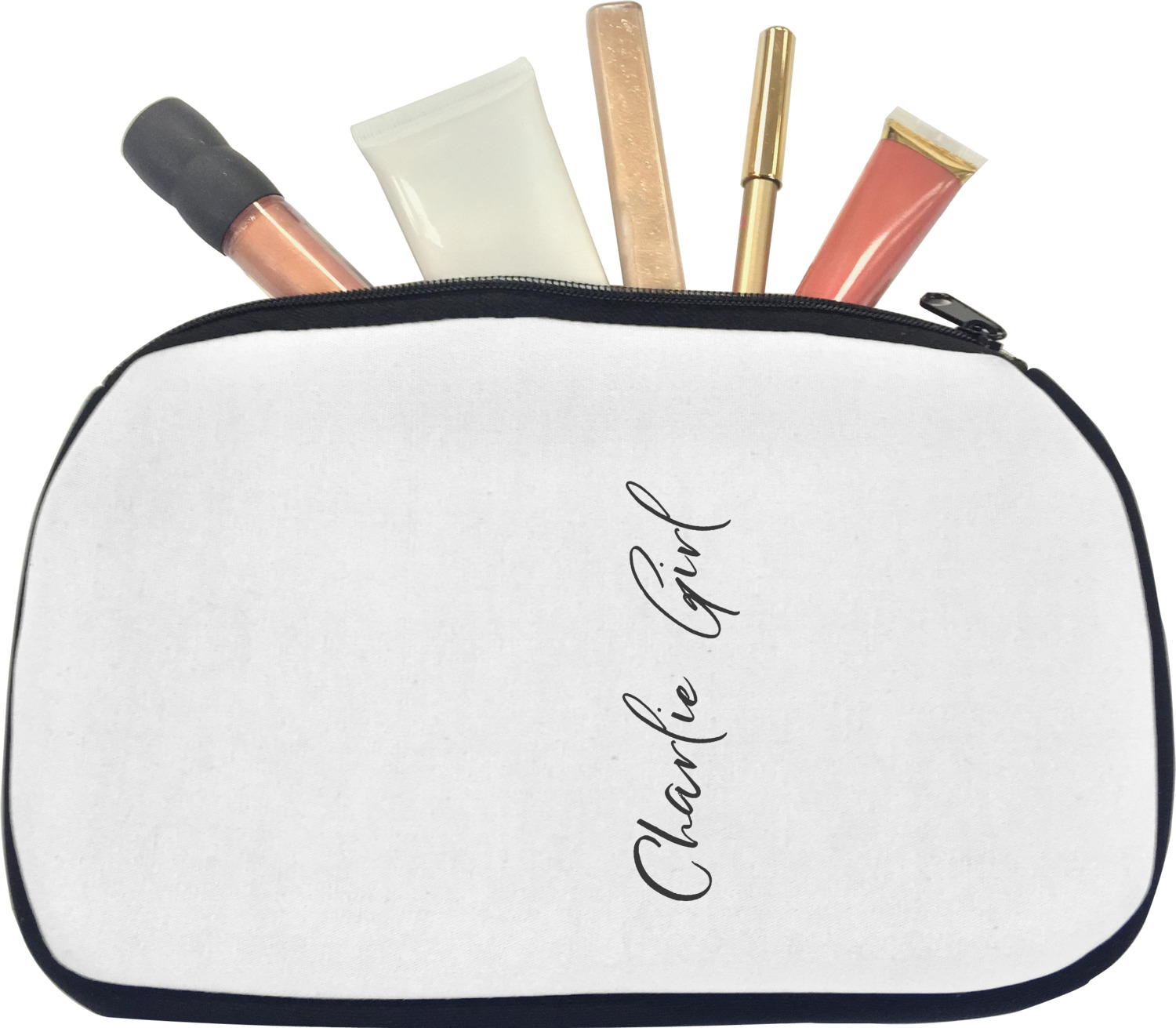 Our personalized makeup bags are available in many different designs, patterns and colors - so you are sure to find one that will love. They are made of neoprene (same material as wet-suits) and thus are water resistant, so spillages in your makeup bag will not end up all over you purse. They are customized on one side and are black on the other side and the zipper is black as well.
