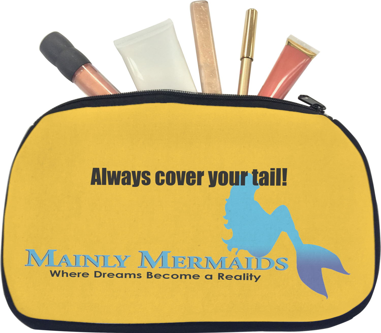 Our personalized makeup bags are available in many different designs, patterns and colors - so you are sure to find one that will love. They are made of neoprene (same material as wet-suits) and thus are water resistant, so spillages in your makeup bag will not end up all over you purse. They are customized on one side and are black on the other side and the zipper is black as well.