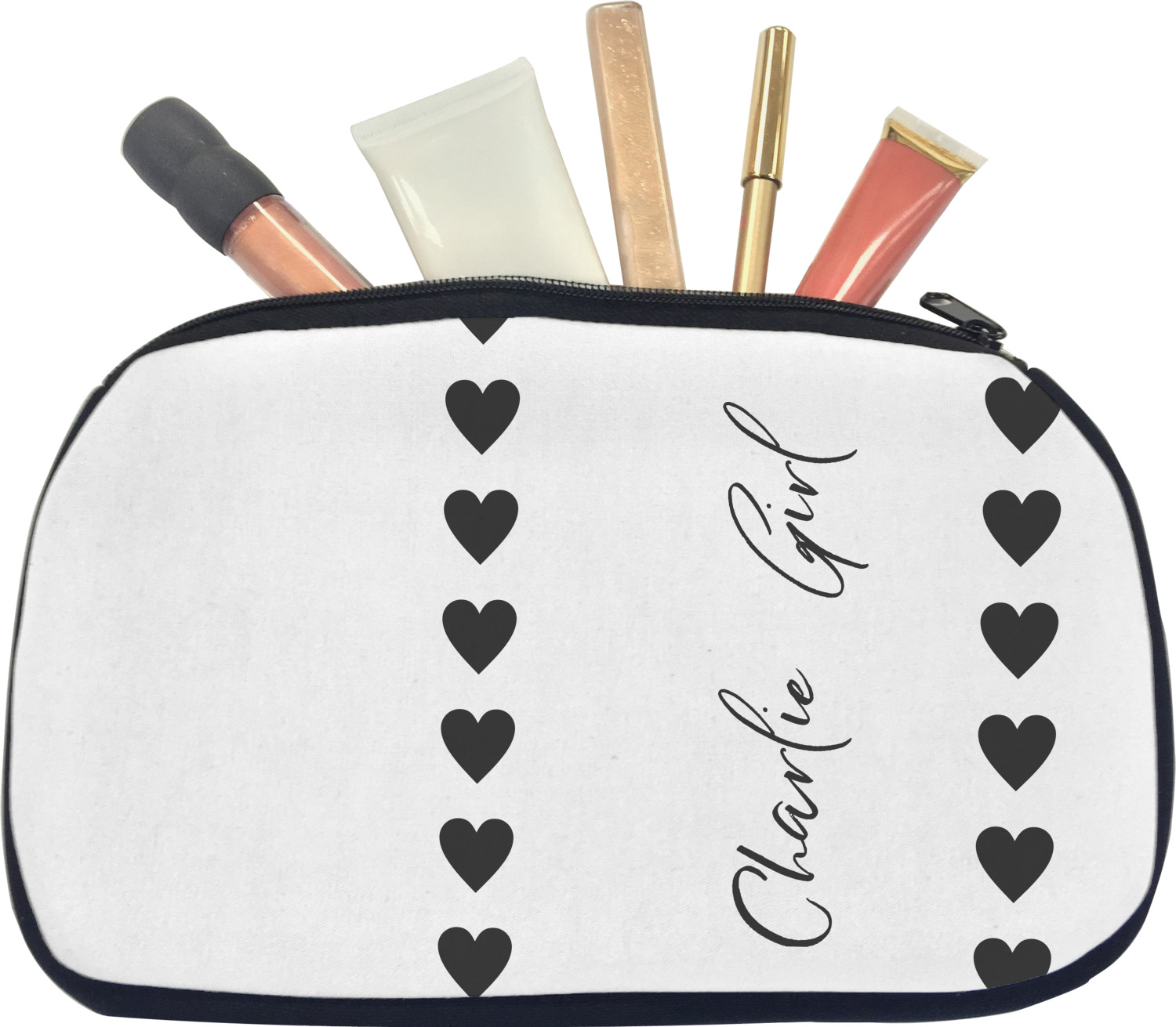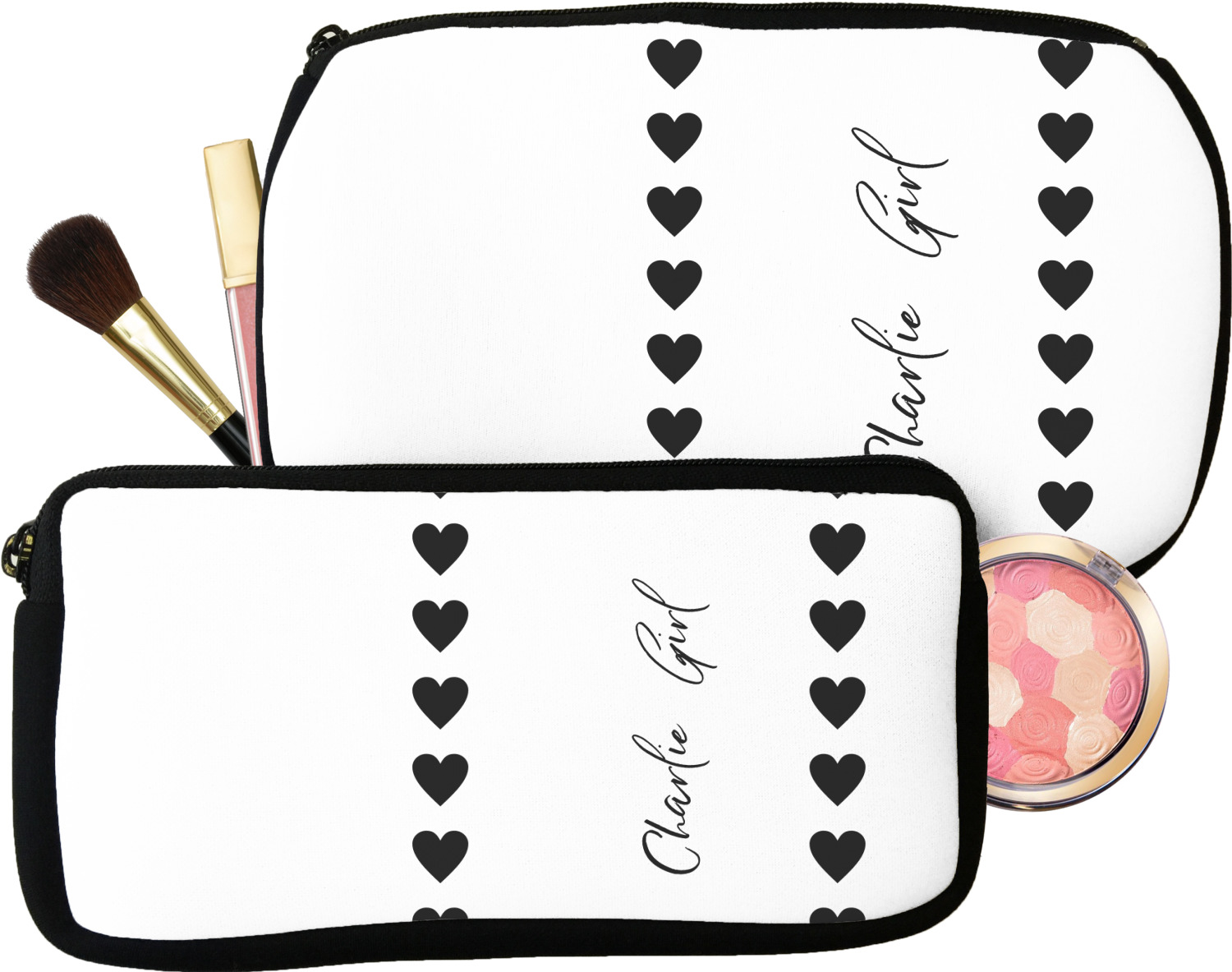 Our personalized makeup bags are available in many different designs, patterns and colors - so you are sure to find one that will love. They are made of neoprene (same material as wet-suits) and thus are water resistant, so spillages in your makeup bag will not end up all over you purse. They are customized on one side and are black on the other side and the zipper is black as well.