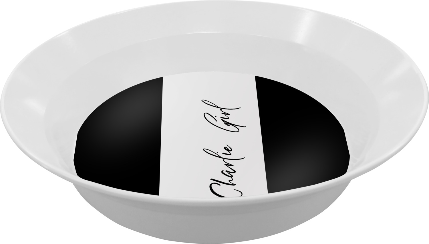 Our melamine dinnerware are BPA free, break-resistant, and dishwasher safe. Our first model has a more functional, standard look, and can hold up to 8 ounces of liquid. The second version we offer has a tapered edge and can hold up to 12 ounces of liquid. Both bowls display your customization on the base of the bowl's inside, and the exterior of the two models are both white.