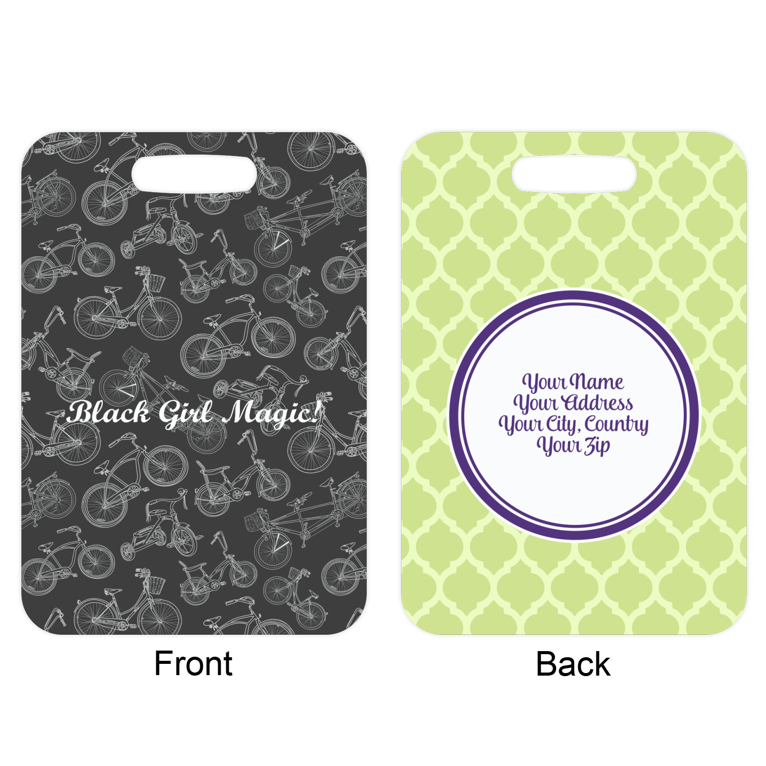 These metal luggage tags are printed on both sides; the front is printed with the design of your choice - and can be personalized with your name, name & initial or your monogram. The back can have as much or as little of your contact information as you desire - your name, your address, city, zip & state, you can also include your phone number and email address. Customize it exactly the way you want it!