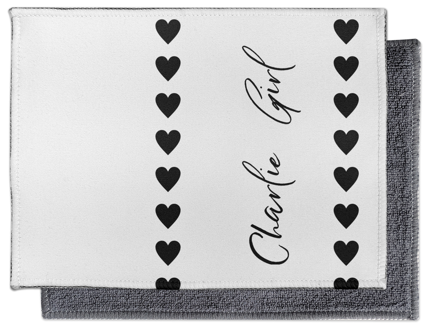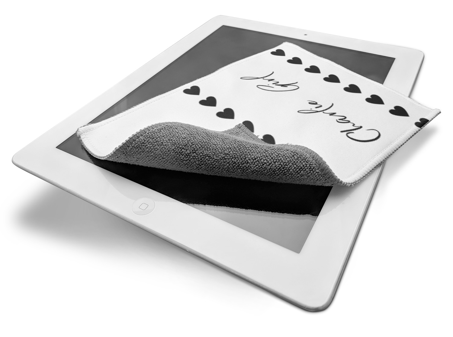 The back of this cleaning cloth is made from a gentle, grey microfiber material, that is masterful at removing smudges, grease, and fingerprints from lenses or electronic screens. The front side of the screen cleaner displays your personalized design in vibrant color. A beautiful stitch lines the edges and secures the microfiber to the polyester top. We provide you with the option of customizing this screen horizontally or vertically, depending on your preferences.