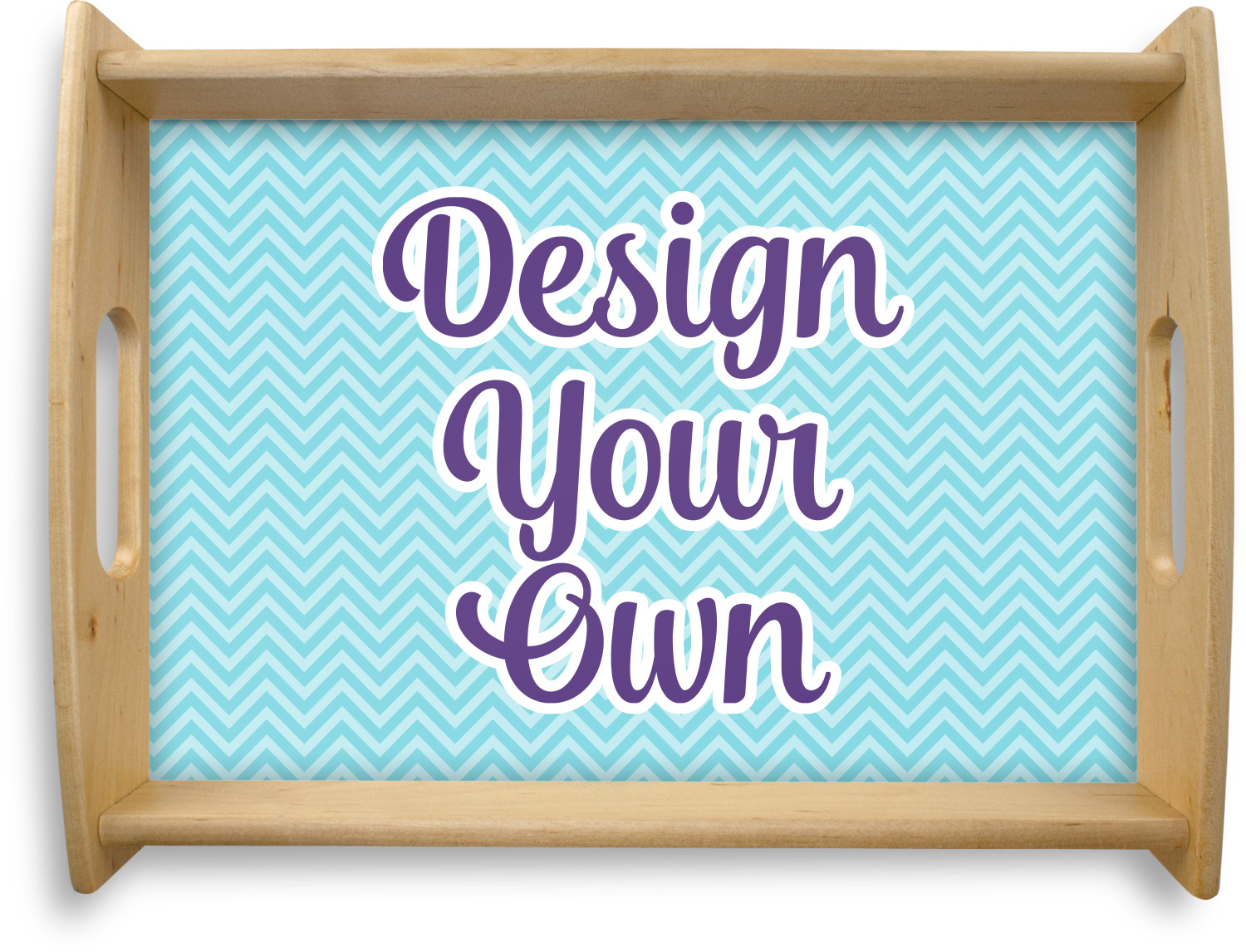 This serving tray with handles features square edges and two rounded sides, creating a very modern look. Each side is fabricated from a beautifully cut, natural wood. The bottom of the interior of the tray displays your customized design in bright, vibrant color. The tray is sold in both a black color and a natural wood look. Each variation of the wood serving tray has two sizes: Small, which is 14" x 10" x 2.25", and Large, which is 19.5" x 13.5" x 2.75".