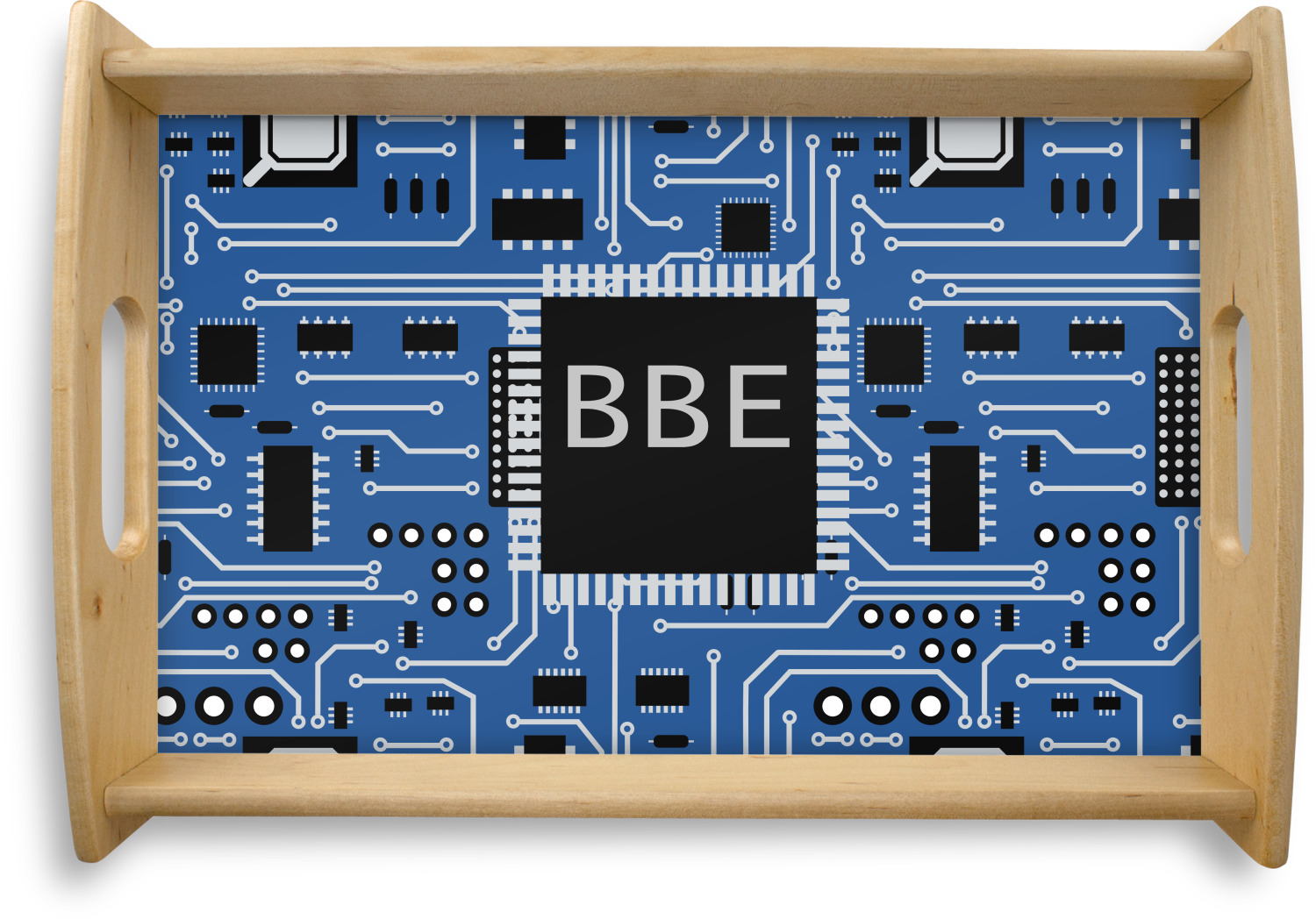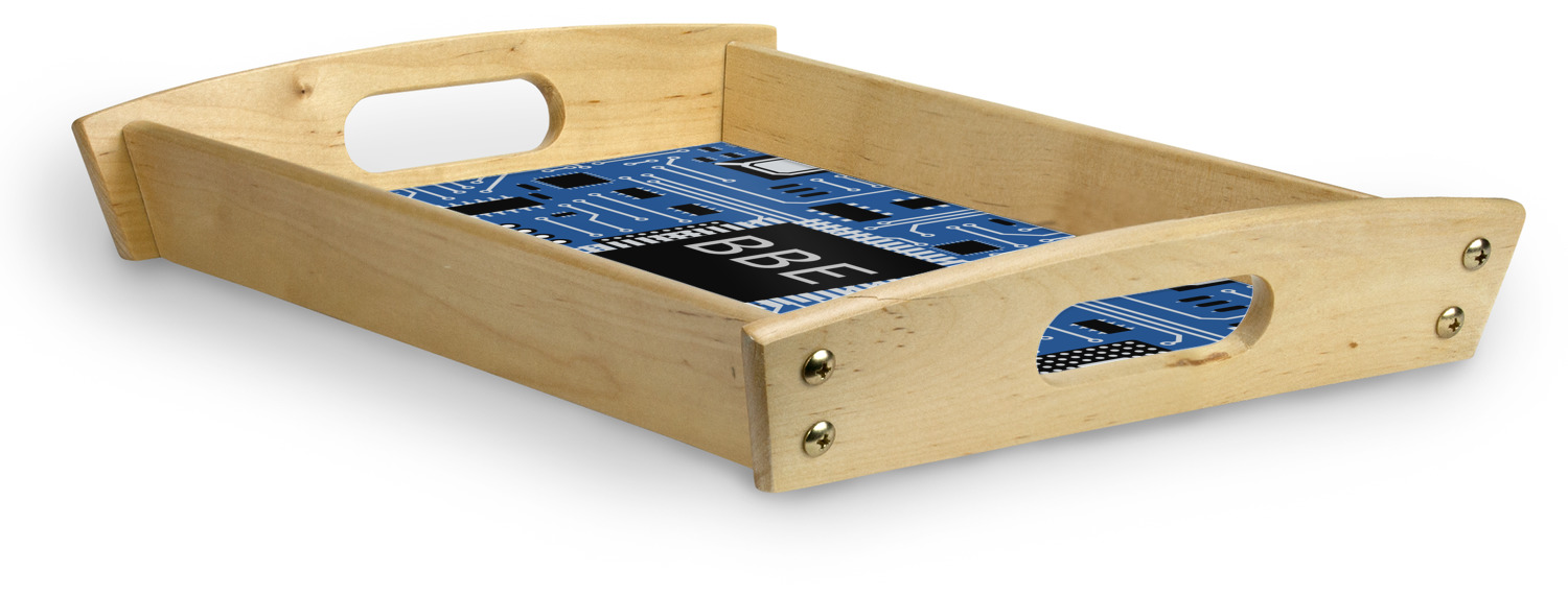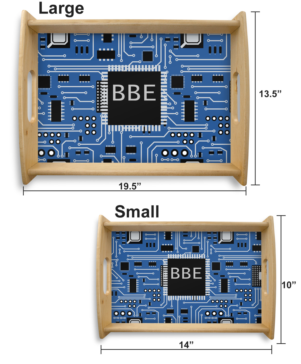 This serving tray with handles features square edges and two rounded sides, creating a very modern look. Each side is fabricated from a beautifully cut, natural wood. The bottom of the interior of the tray displays your customized design in bright, vibrant color. The tray is sold in both a black color and a natural wood look. Each variation of the wood serving tray has two sizes: Small, which is 14" x 10" x 2.25", and Large, which is 19.5" x 13.5" x 2.75".